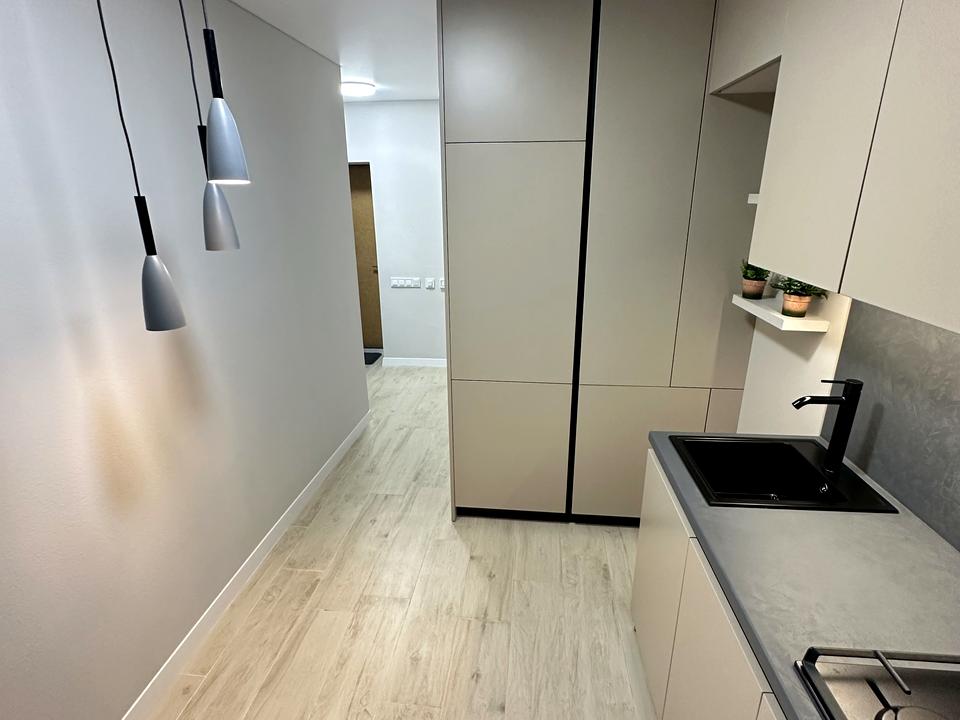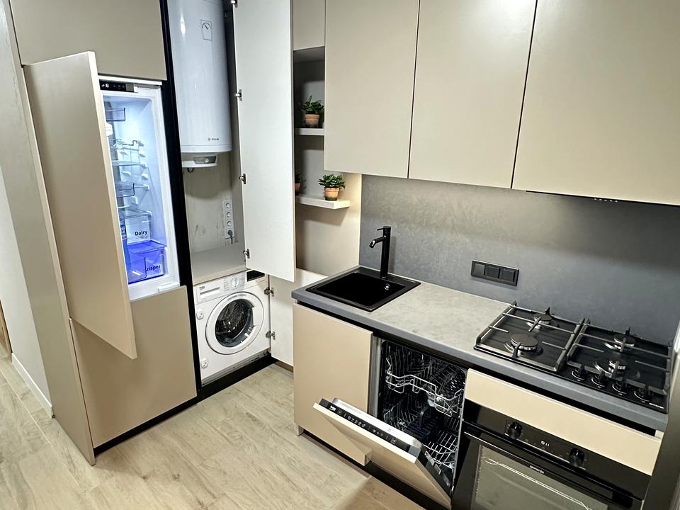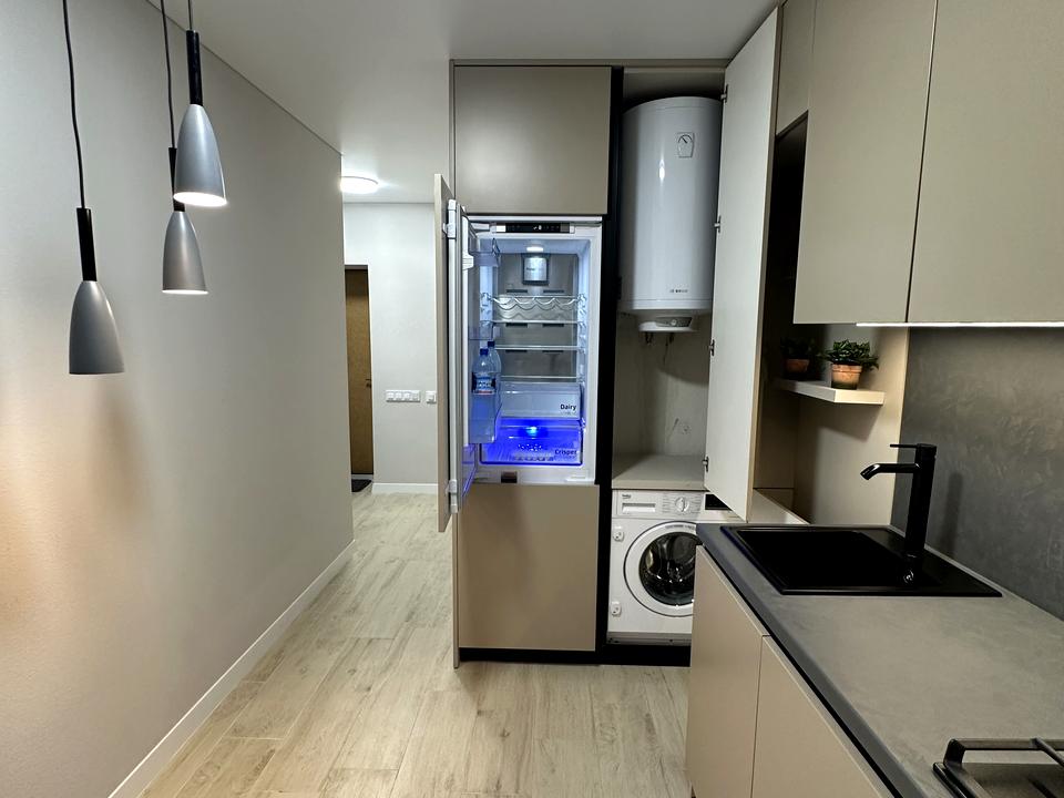- кухня: фасади з МДФ. Повний набір техніки - вбудований холодильник, вбудована пральна машина, посудомийна машина, бойлер, варильна поверхня (газ), духова шафа, бойлер на 100 літрів