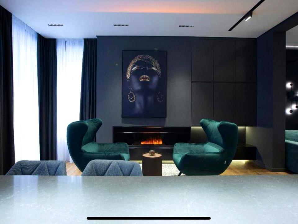 Шикарний камін та велика зручна вітальня, вся техніка та кухонне приладдя, гардеробна зона, безліч вбудованих шаф, окрема спальня, видовий балкон з місцем для відпочинку.