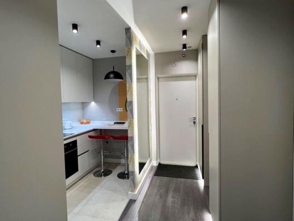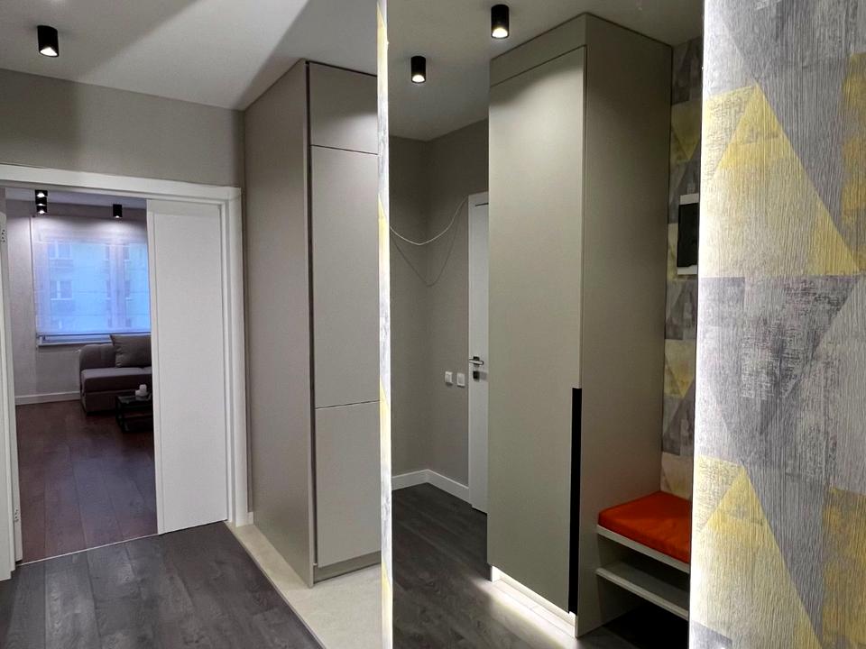 В СУ огромное зеркало с подсветкой, подсветка лэд над столешницей в кухне, при входе огромное зеркало с лэд подсветкой, также с подсветкой шкафы в прихожей.