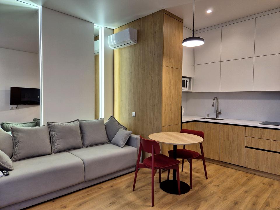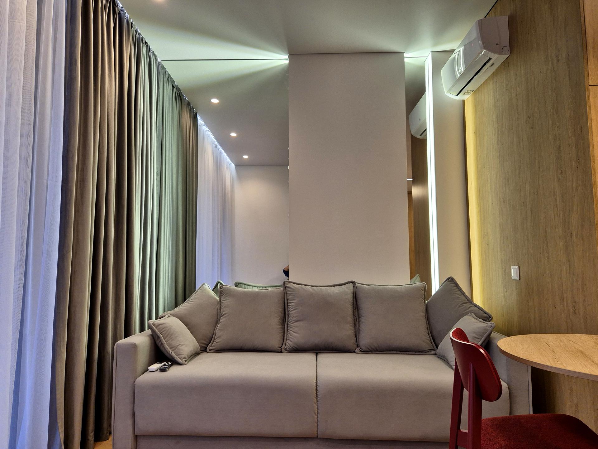 Якісні м'які меблі , ліжко з підйомним механізмом і нішею для зберігання речей. Диван в зоні вітальні розкладний.