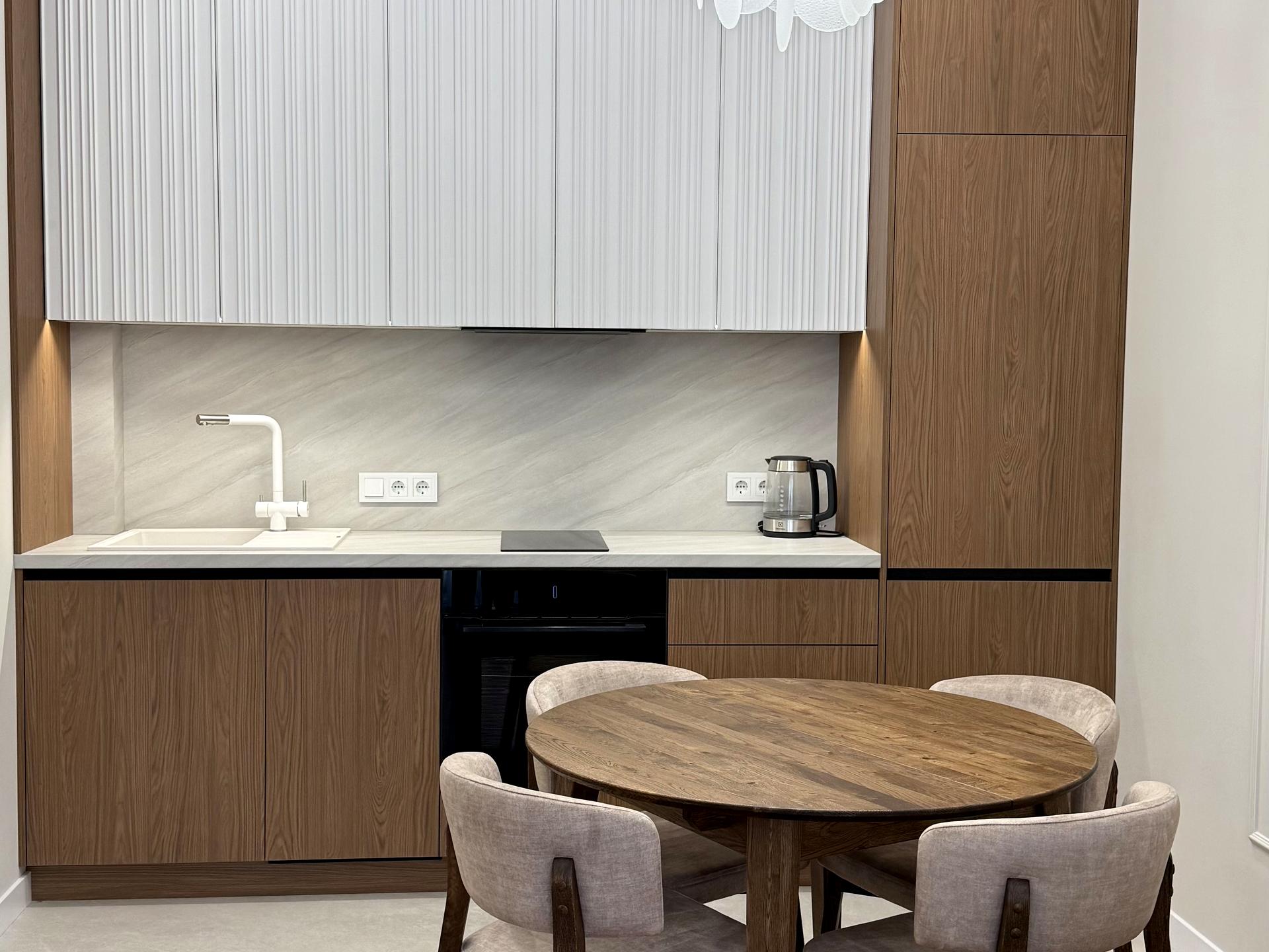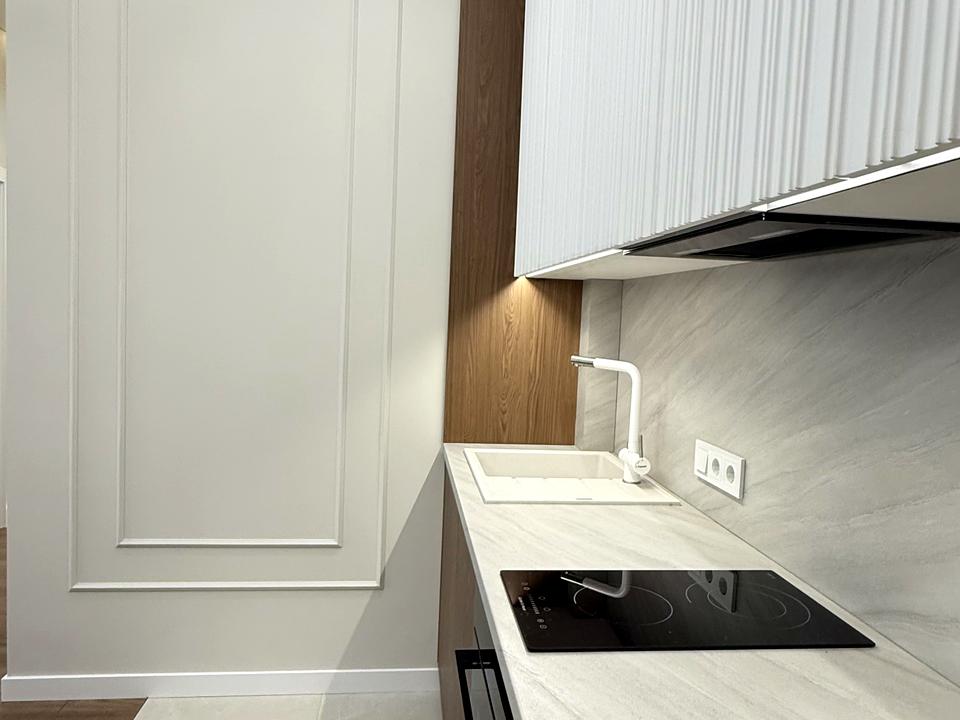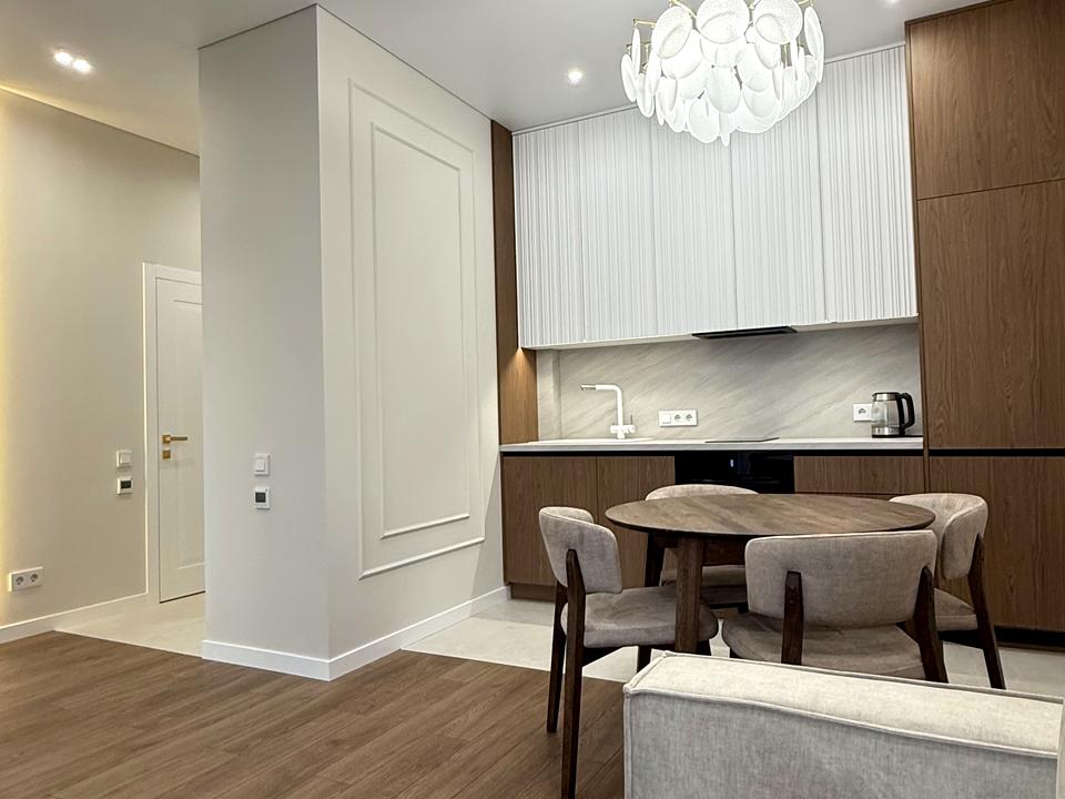 Простора кухня-вітальня облаштована вбудованою кухнею з технікою: посудомийна машина, холодильник, варочна поверхня, духова шафа - німецького виробника Bosch. Санвузол з ванною, пральна машина-автомат з сушкою. Німецька сантехніка. «Тепла підлога» в коридорі, на кухні і в санвузлі. Ортопедичний диван у вітальні, смарт- TV, спальня з 2-спальним ліжком. Шафи-купе у спальні та прихожій.