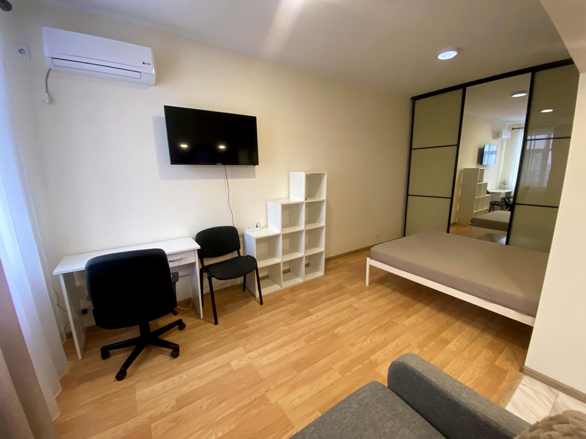 В квартире 1 комната. Планировка комнат Студия. Кухонная плита электрическая. Есть балкон. В квартире есть Телевизор, Кабельное ТВ, Утюг, Кондиционер, Стиральная машина, Ванна, Холодильник, Микроволновка, Посуда, Сигнализация. Дом построен в 2017 году. Общее состояние квартиры - С ремонтом. Безбарьерность: вход в дом на уровне земли, лифт, приспособленный к инвалидной коляске, дверные проемы в доме шириной более 0.9 м. Горячая вода - электрический бойлер. Количество санузлов: 1. Работает без света - вода, интернет. Комиссия за услуги 50 %
