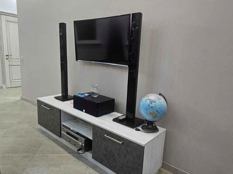 У спальні — двоспальне ліжко, комод і шафа. У коридорі — простора шафа-купе, що виконує функцію гардеробної. У спальні та вітальні — LED-телевізори, у вітальні додатково встановлена система домашнього кінотеатру, два зручні дивани та обідня зона. Є просторий засклений балкон. У санвузлі: душова кабіна, біде, бойлер, пральна машина та електросушарка для рушників. Встановлені пожежна та охоронна сигналізації з відеодомофоном.