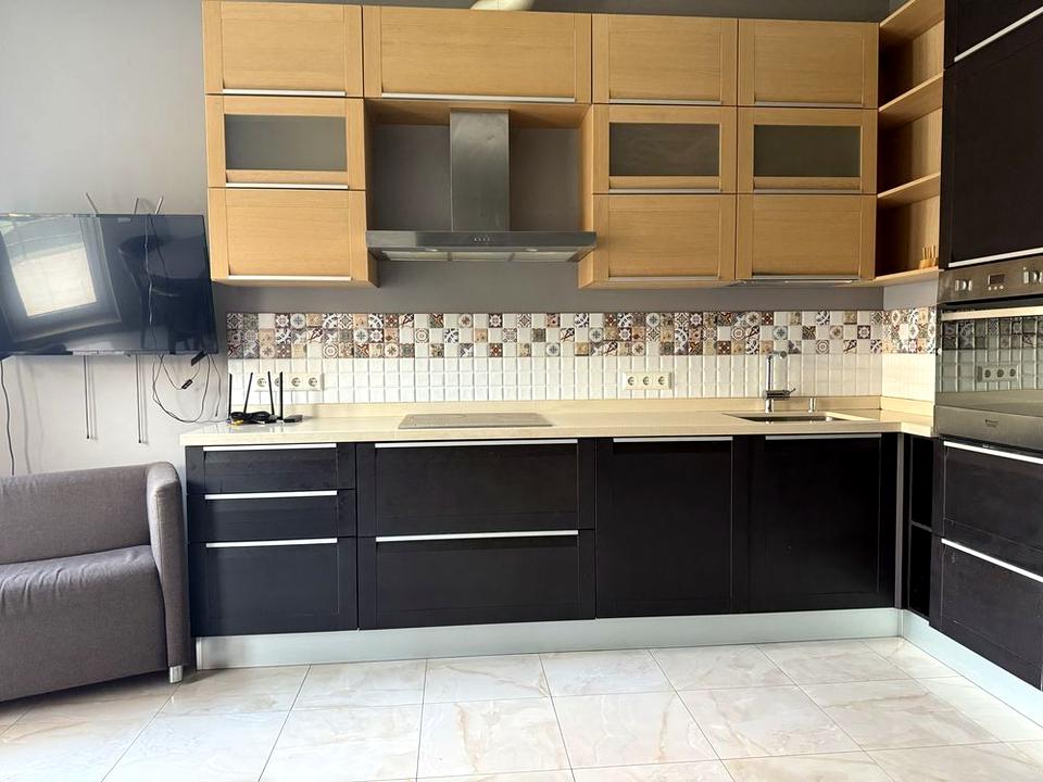 вбудована кухня з побутовою технікою (посудомийна машина, варильна поверхня, витяжка, духова шафа, чайник, мікрохвильова піч, холодильник, дрібний посуд);