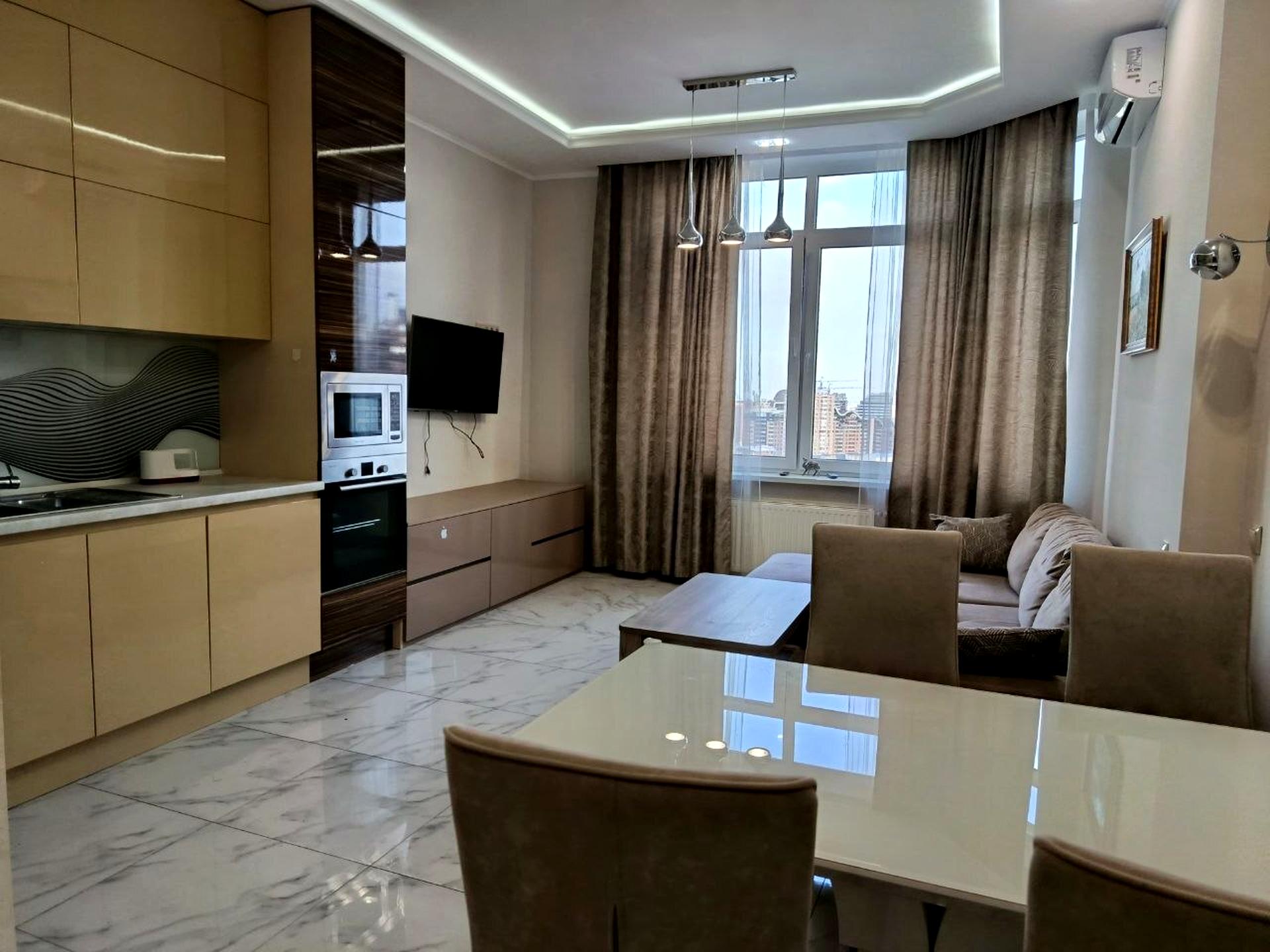 В квартире 3 комнаты, Технологія будівництва - Монолітно-каркасна, Тип будинку - Спец. проект. В квартире есть Телевизор, Кондиционер, Стиральная машина, Холодильник, Микроволновка, Посудомойная машина. Дом построен в 2018 году. Общее состояние квартиры - С ремонтом. Работает без света - вода, отопление, интернет, лифт. Без комиссии
