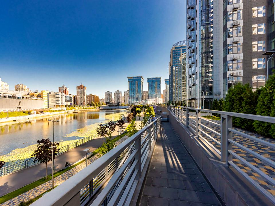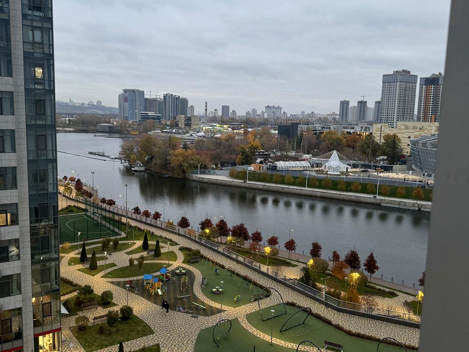 • Вид з вікон: на затоку Дніпра, частково видно правий берег Києва, Києво-Печерську лавру та «Батьківщину-Мати».