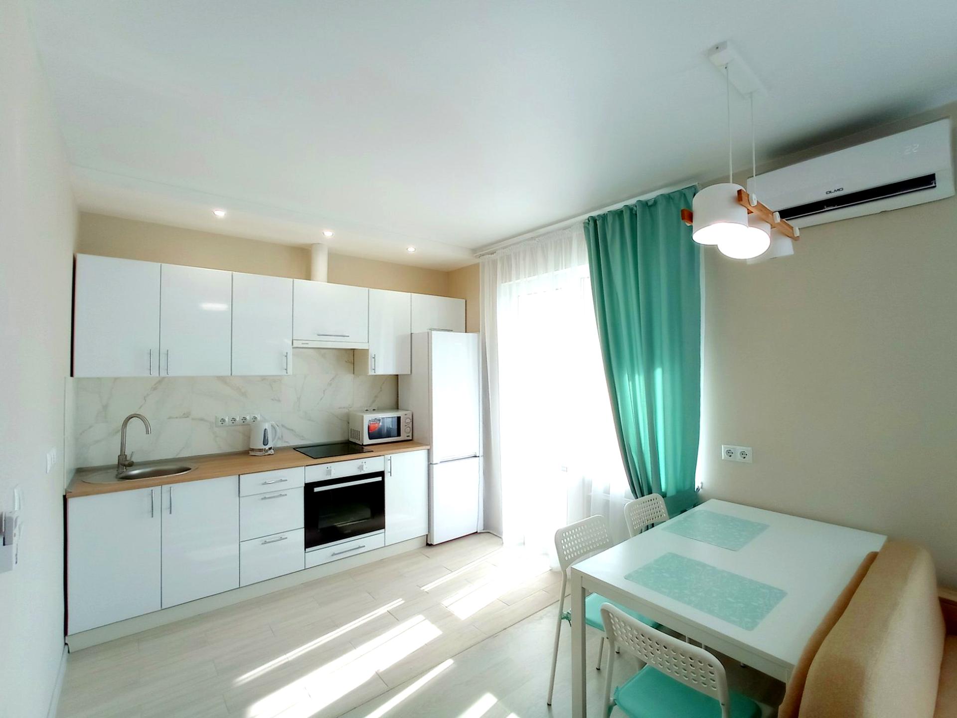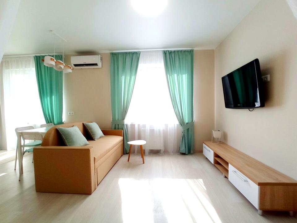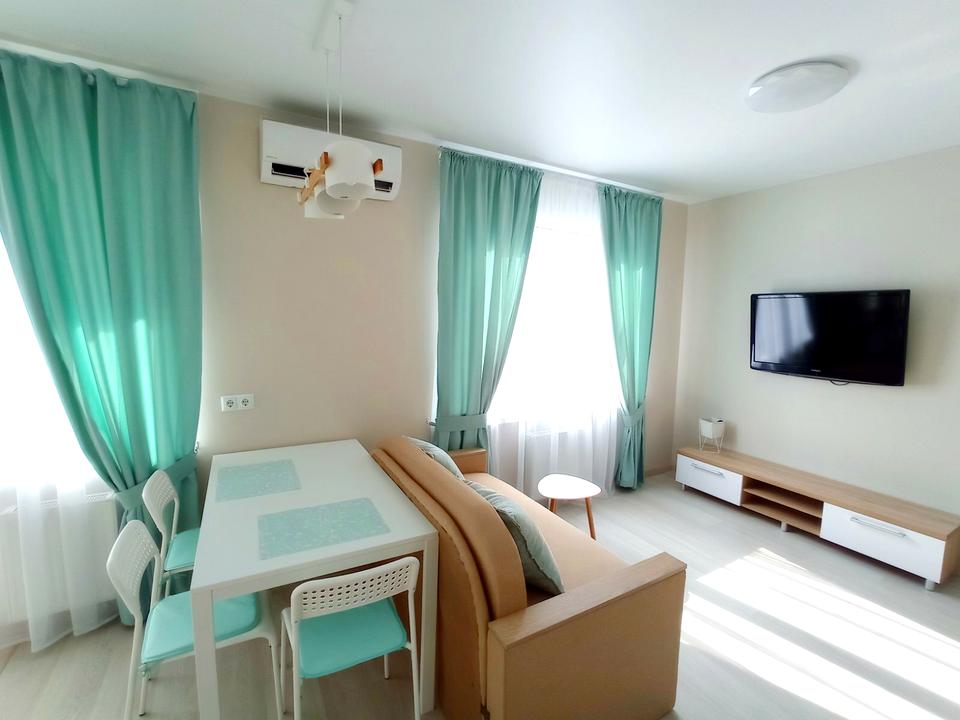 Светлая просторная квартира-студия с дизайнерским ремонтом, полностью оборудованная всей необходимой новой мебелью (большая двухспальная кровать, раскладной диван, кухня, большой шкаф-купе) и новой техникой (ванная, бойлер, стир. машина, духовка, вытяжка, кондиционер, телевизор, микроволновка, чайник, роутер).