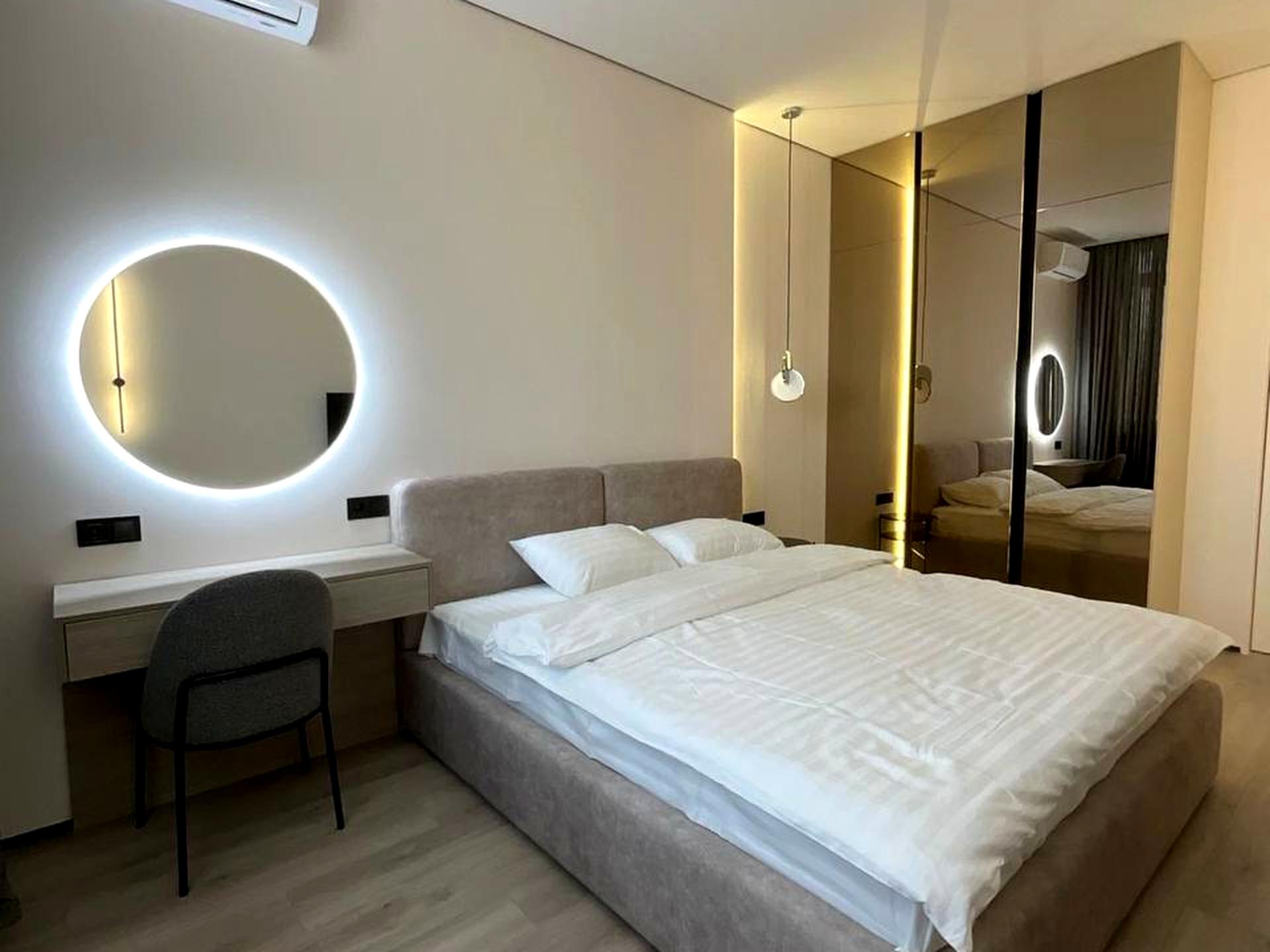 Окрема спальня, має містку шафу, для зберігання речей, двоспальне ліжко, бʼюті зону з великим дзеркалом яке підсвічується, кондиціонер,