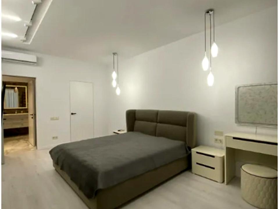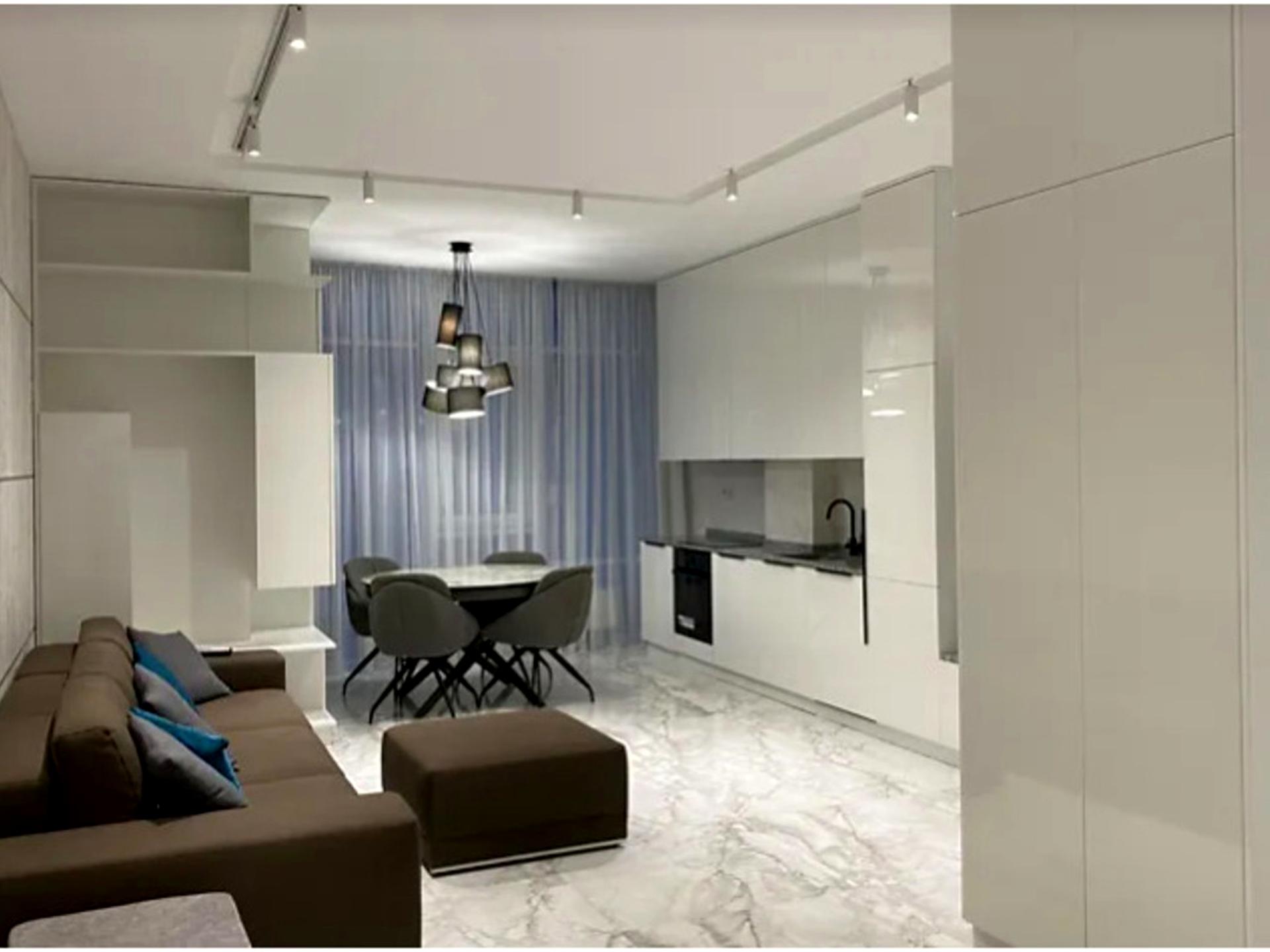Дизайнерський ремонт у світлих кольорах. Дві спальні та кухня-вітільня. Вбудовані меблі, техніка відомих виробників, два санвузли з душовими кабінами і є ванна, дві гардеробні, 2 шафи-купе, 2 бойлери по 100літрів кожний, висота стелі - 3м.Підігрів підлоги, охоронна сигналізація.