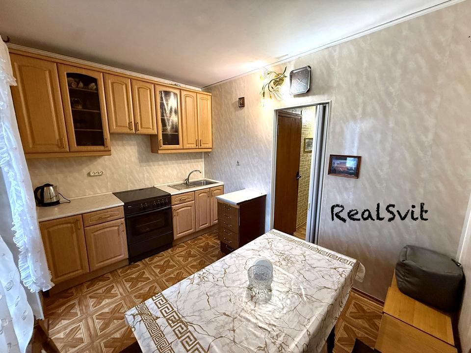 У кухні- вбудована кухня, холодильник, електроплита, духова шафа, стіл та мʼякий куточок, чайник. Є вихід на засклений балкон.