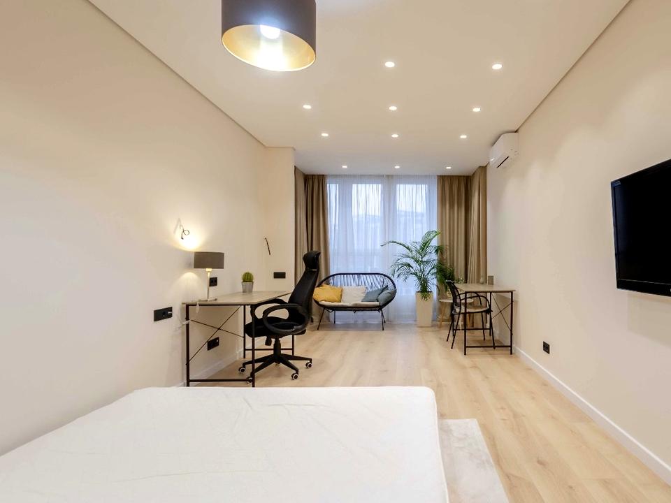 Ідеальне планування: кухня-вітальня з якісним диваном, TV та зоною для прийому гостей, три окремі кімнати, кожна з кондиціонером, шафою, робочим або навчальним місцем.