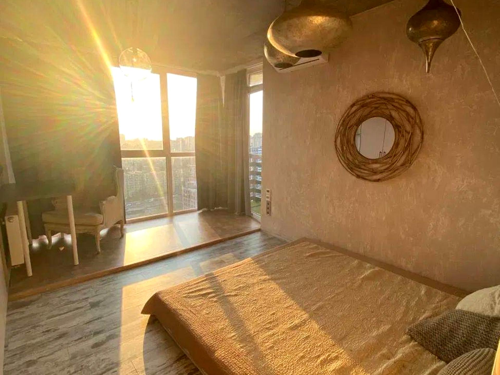 1. Спальня з панорамними вікнами, невеликим балконом та проєктором — ідеальне місце для відпочинку
