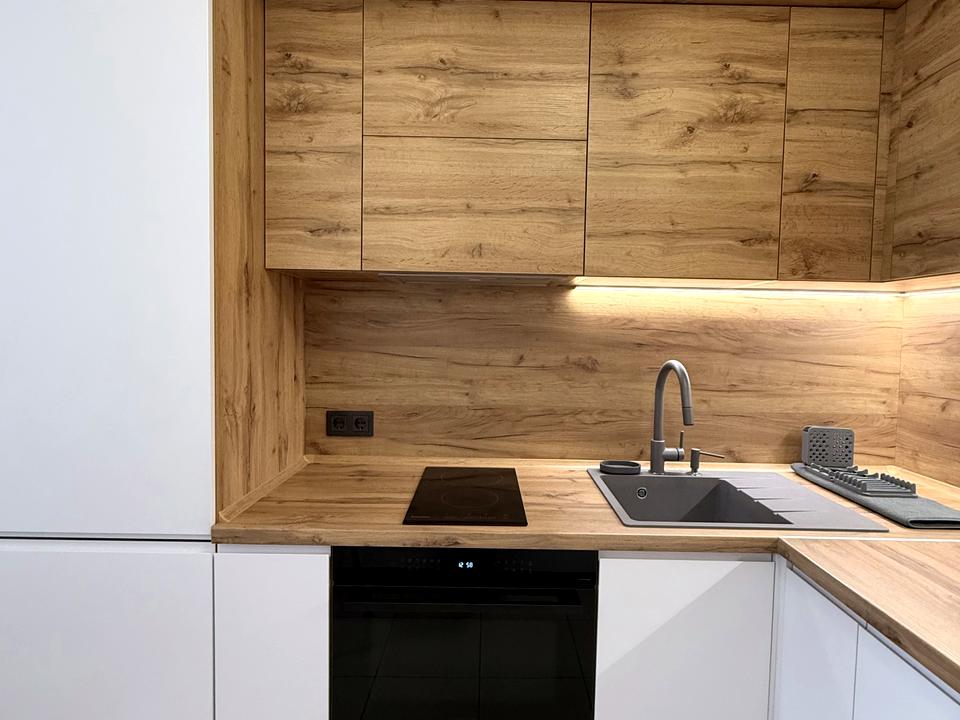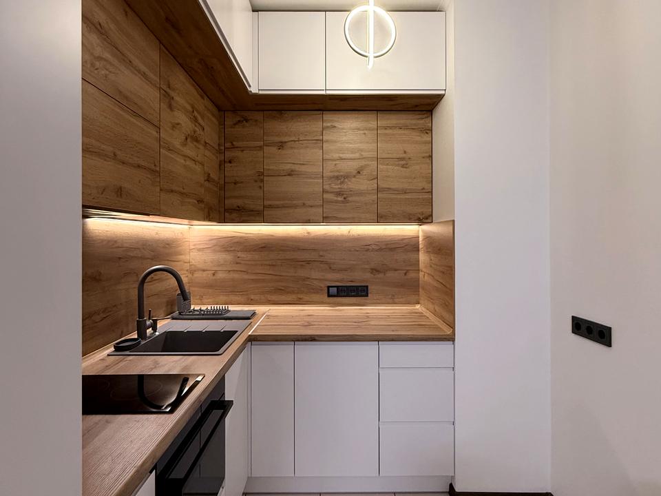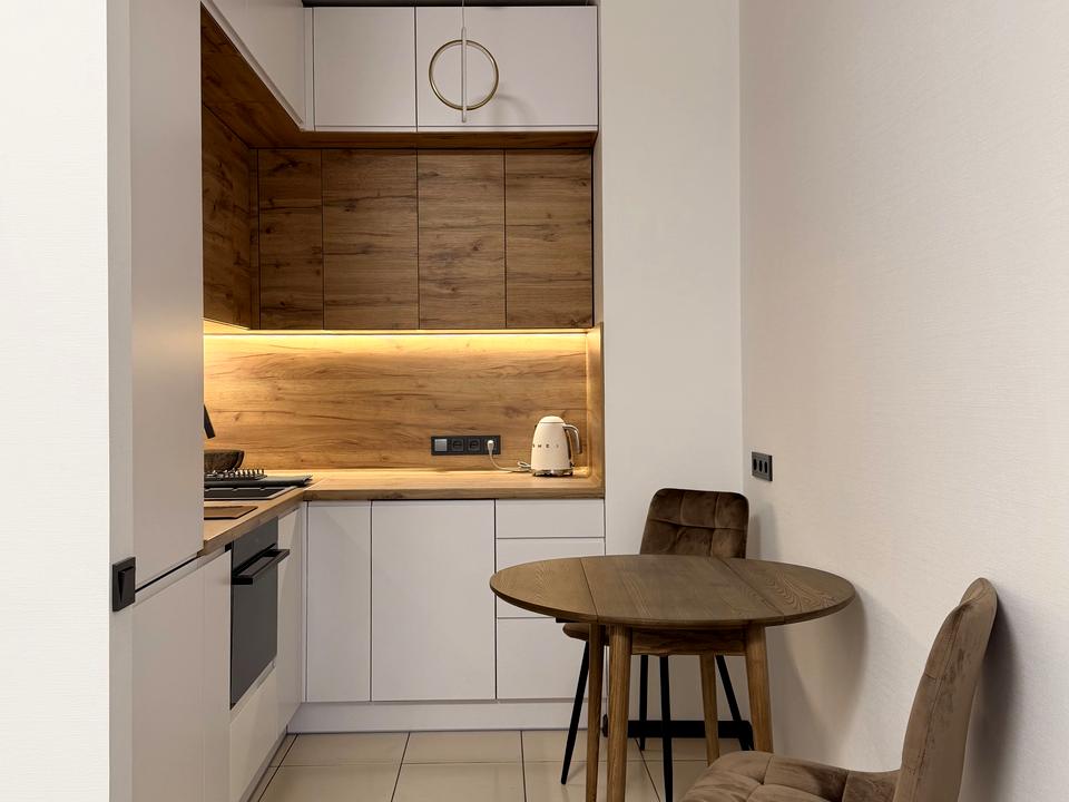 Отлично продумана система хранения, много шкафов. Вся техника.