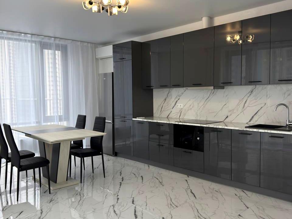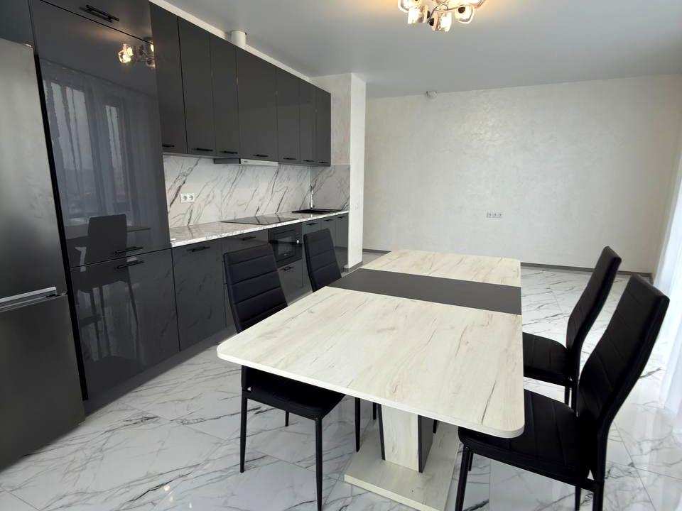 Світла та простора кухня обладнана усією необхідною побутовою технікою — посудомийна машина, холодильник, індукційна варильна поверхня, витяжка, електропіч із функцією СВЧ, інверторний кондиціонер.