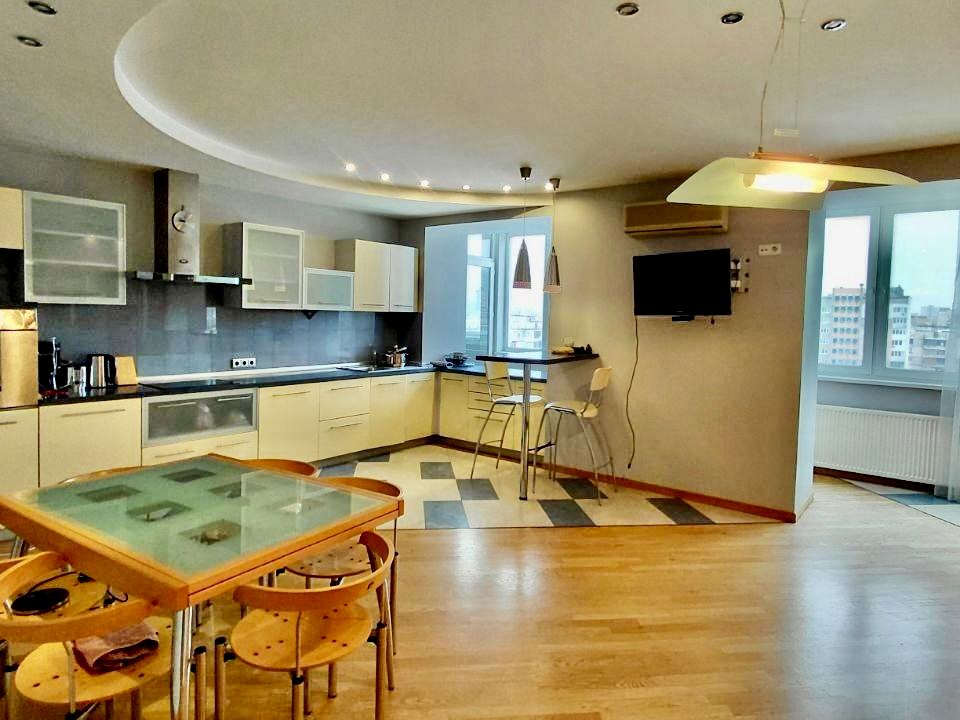 Пропонується в оренду простора дворівнева квартира площею 200 м², розташована на 9 та 10 поверхах будинку. Раціональне планування та велика площа роблять її комфортним варіантом для родини або орендарів, які цінують простір.
