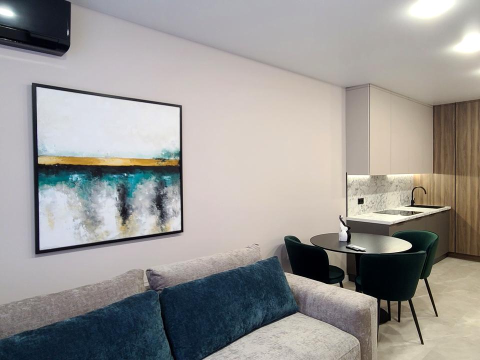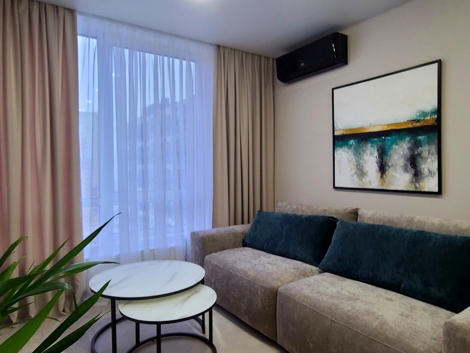 В кухні - вітальні є гостьова зона з просторим диваном, Samsung Smart TV 55'' та кондиціонер.