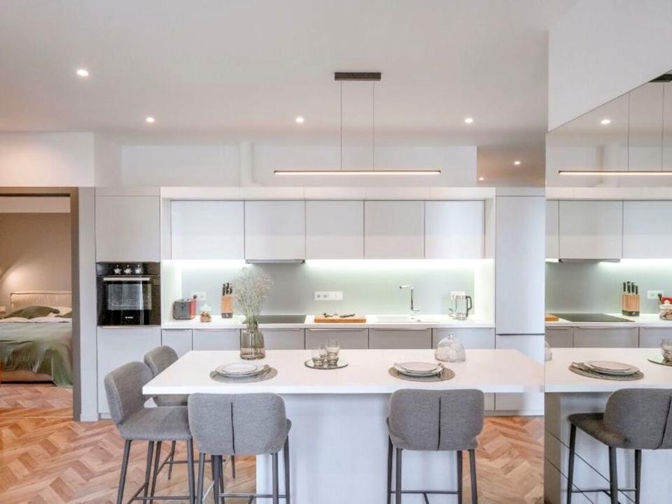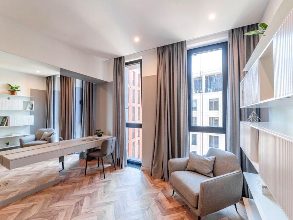 Простір вільного призначення, де розташувалася стильна острівна кухня, укомплектована розширеним набором побутової техніки та необхідним посудом, а також зони для відпочинку та роботи, дозволяючи затишно та зручно усамітнитися.