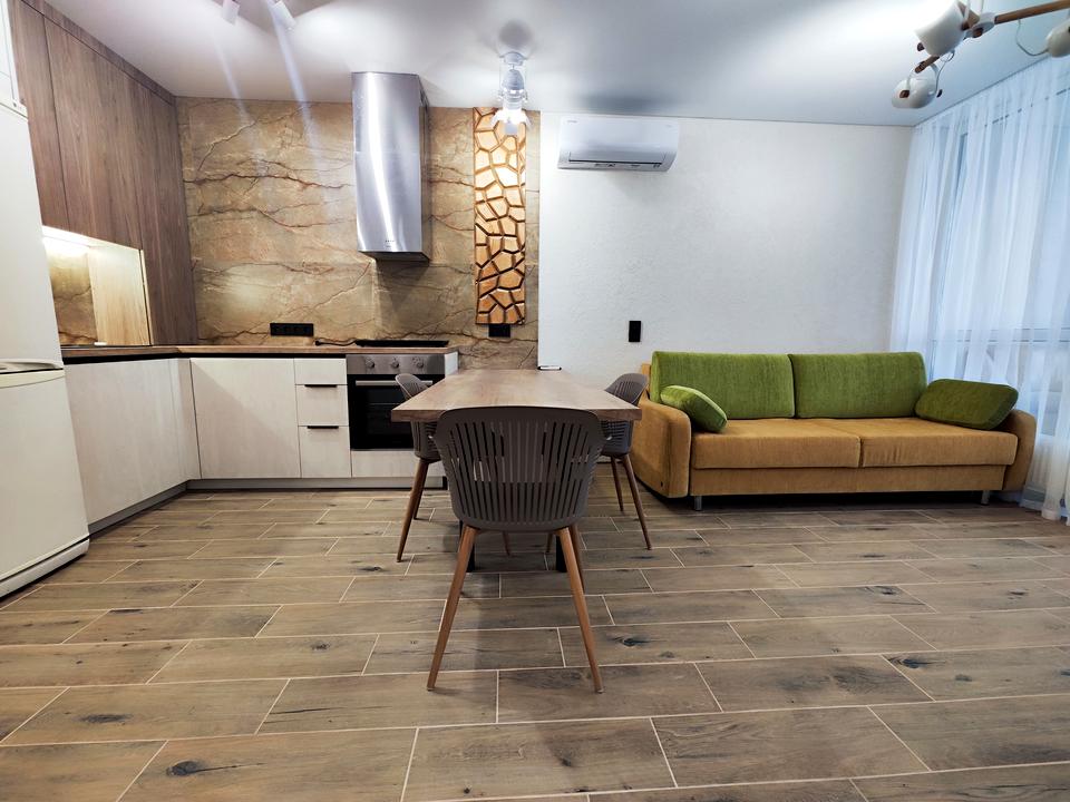 Простора кухня-вітальня і окрема спальня. Різнопланове освітлення. Повністю укомплектована меблями і технікою відомих брендів (в т.ч. посудомийна машина 60см, бойлер, кондиціонер, холодильник, вбудована духова шафа, телевізор, пральна машина). Встановлена система антипотоп. Засклена лоджія.