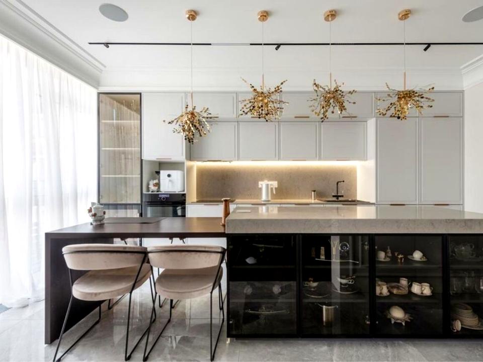Функціональне зонування включає: велику кухню, поєднану з вітальнею; master bedroom із власною розкішною гардеробною кімнатою та санвузлом; дві додаткові спальні (дитяча, гостьова), кабінет, додаткову гардеробну. У квартирі три санвузли, пральна кімната та просторий передпокій.