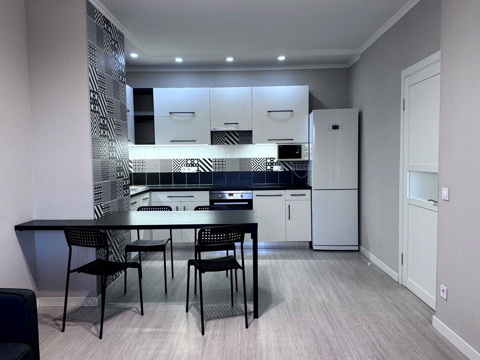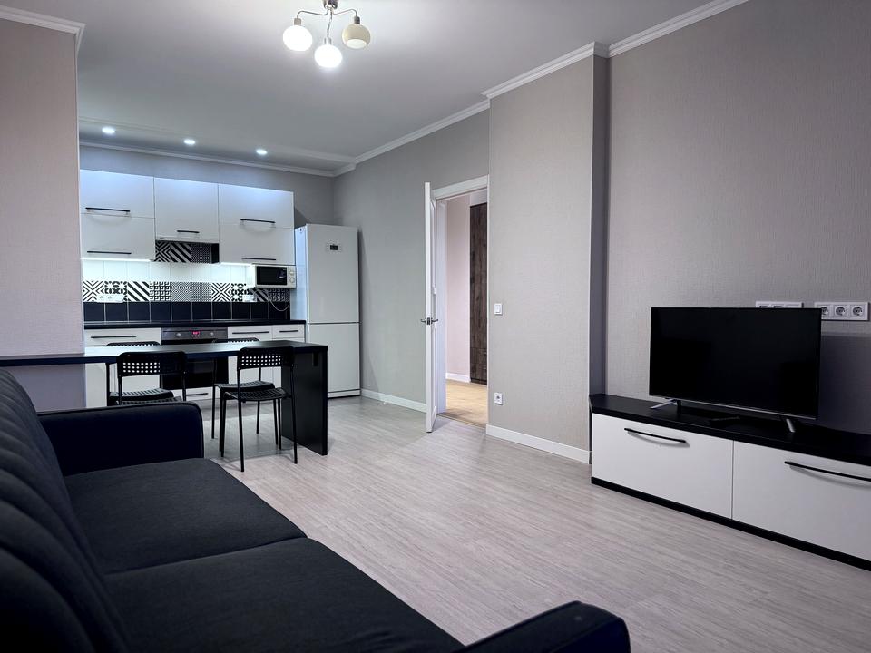 У спальні світло-сірих тонів двоспальне ліжко, велика шафа-купе, кондиціонер, Smart TV, вихід на видовий, просторий, засклений балкон; в кухні-вітальні великий розкладний диван, вбудована кухня, вся побутова техніка , обідня зона, кондиціонер. Smart TV, посудомийна машина.