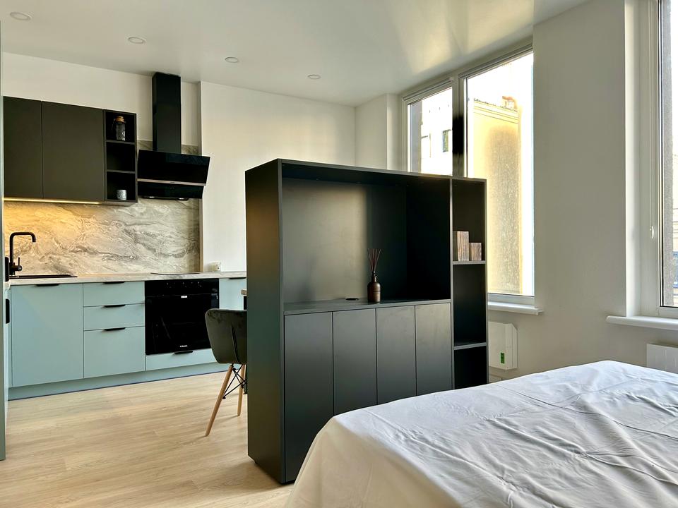 В квартире 1 комната, высота потолков 3.3 метра, Технологія будівництва - Монолітно-каркасна, Тип будинку - Спец. проект. Кухонная плита электрическая. Балкона нет. В квартире есть Кондиционер, Стиральная машина, Душевая кабина, Холодильник, Микроволновка. Дом построен в 2022 году. Общее состояние квартиры - С ремонтом. Горячая вода - электрический бойлер. Количество санузлов: 1. Тип кухни - кухня-студия. Количество спален: 1. Комиссия за услуги 50 %