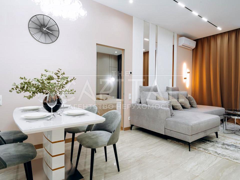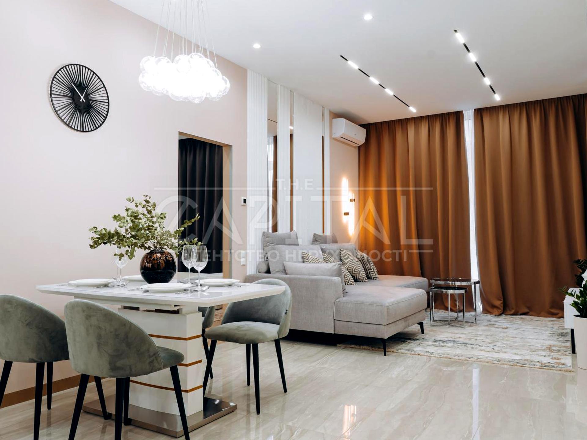 Кухня-студія: Серце квартири — простора кухня-студія, ідеальне місце для зборів близьких та друзів. Вишуканий дизайн простору підкреслює індивідуальність, а функціональне розміщення елементів робить кожен вечір неповторним.