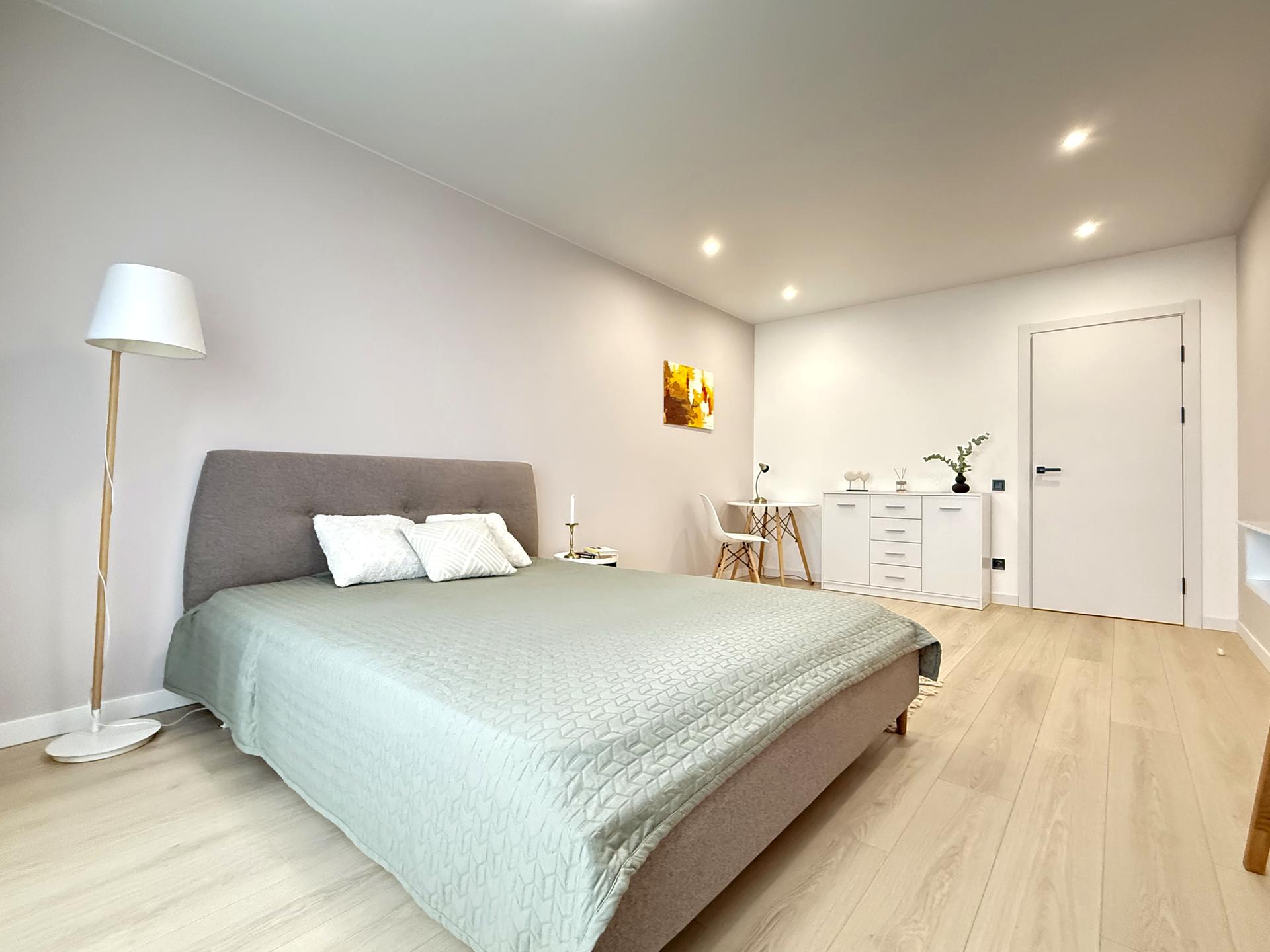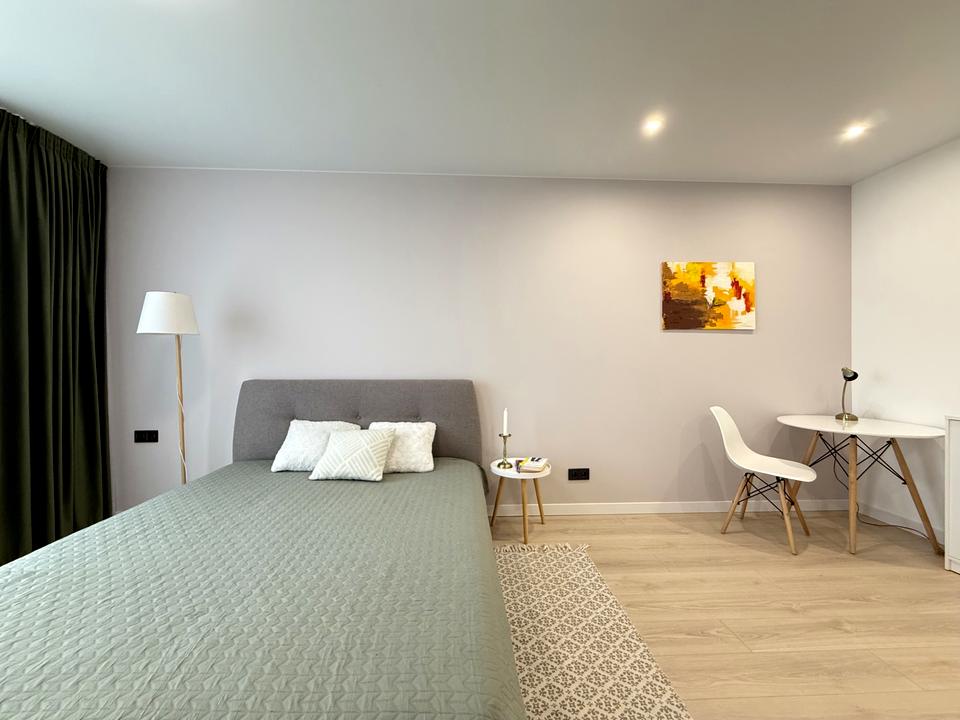 Квартира має кухню-студію, окрему кімнату та велику гардеробну, що дозволяє зручно організувати простір.