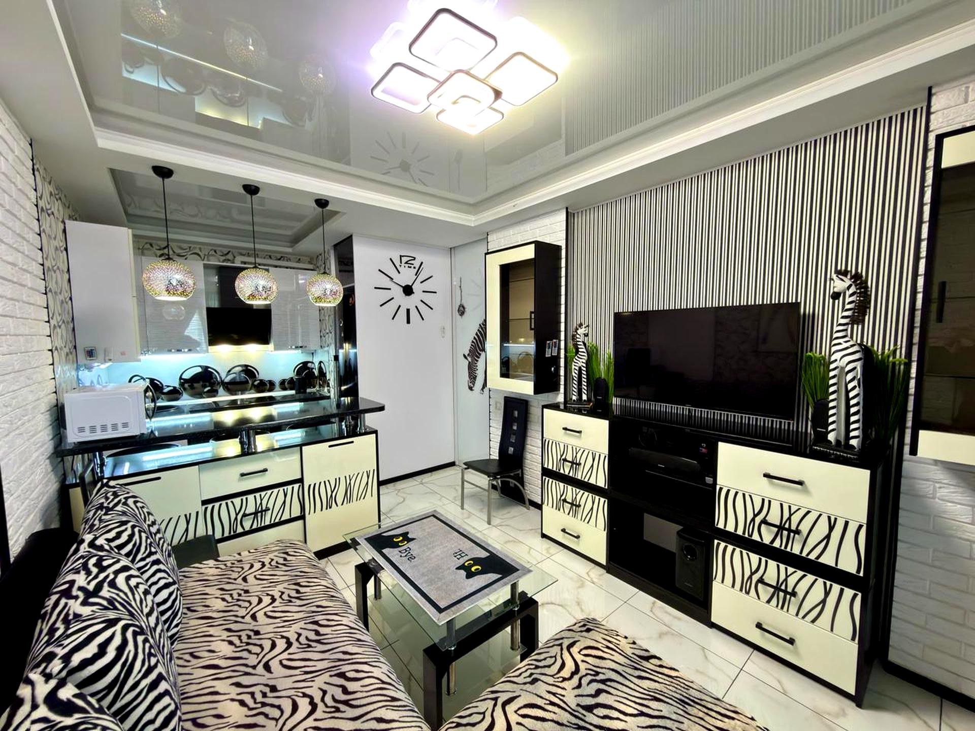 У кухні-вітальні є електро плита, духова шафа, витяжка, барна стійка з поличками і стільцями, журнальний столик, великий місткий холодильник, мікрохвильова піч, чайник, smart телевізор та тумба під нього, розкладний диван.