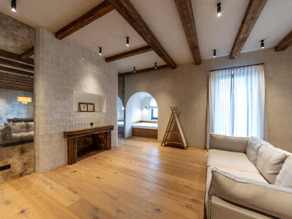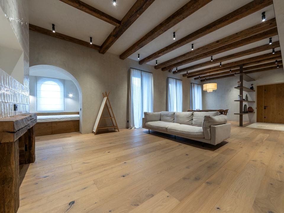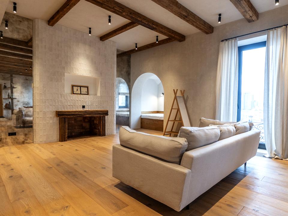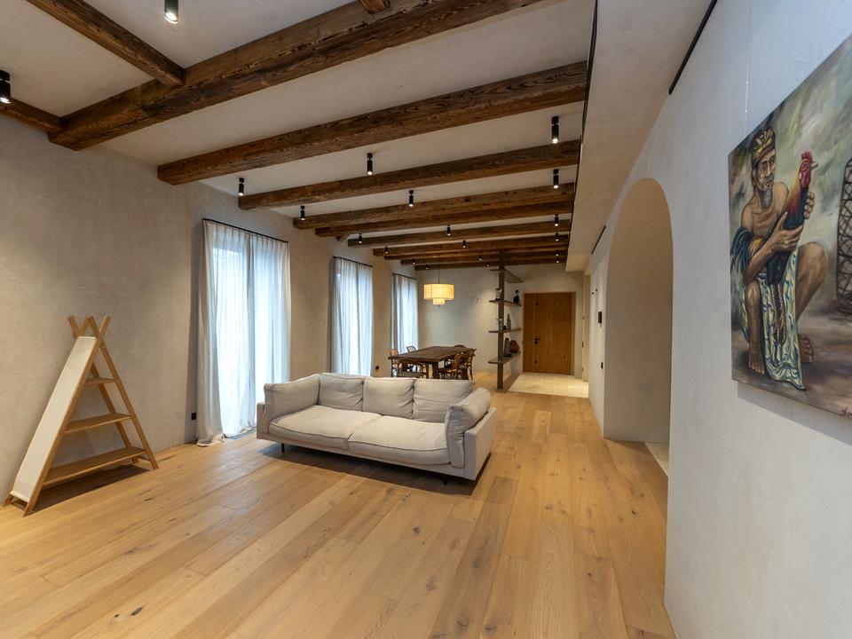 Квартира бездоганно оброблена натуральною штукатуркою, доповнена паркетом і мармуровою підлогою, а також автентичні дерев’яні елементи.