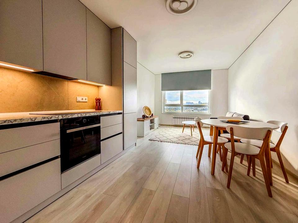 У квартирі: кухня-вітальня, дві спальні, ванна кімната з душовою кабіною, постирочно-побутове приміщення та вбиральня. Квартира повністю мебльована та оснащена необхідною побутовою технікою (включаючи кондиціонери, пральну та посудомийну машини). У квартирі панорамні вікна, з яких відкриваються чудові краєвиди на р. Дніпро та правий берег Києва.