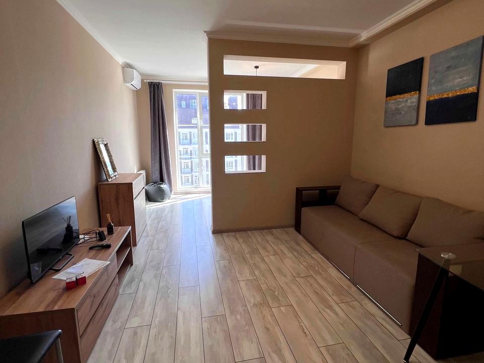 В квартире 1 комната, Тип будинку - Спец. проект. В квартире есть Телевизор, Кабельное ТВ, Кондиционер, Стиральная машина, Душевая кабина, Холодильник, Микроволновка. Дом построен в 2020 году. Общее состояние квартиры - С ремонтом. Горячая вода - электрический бойлер. Работает без света - вода, отопление. Тип кухни - кухня-студия. Комиссия за услуги 50 %