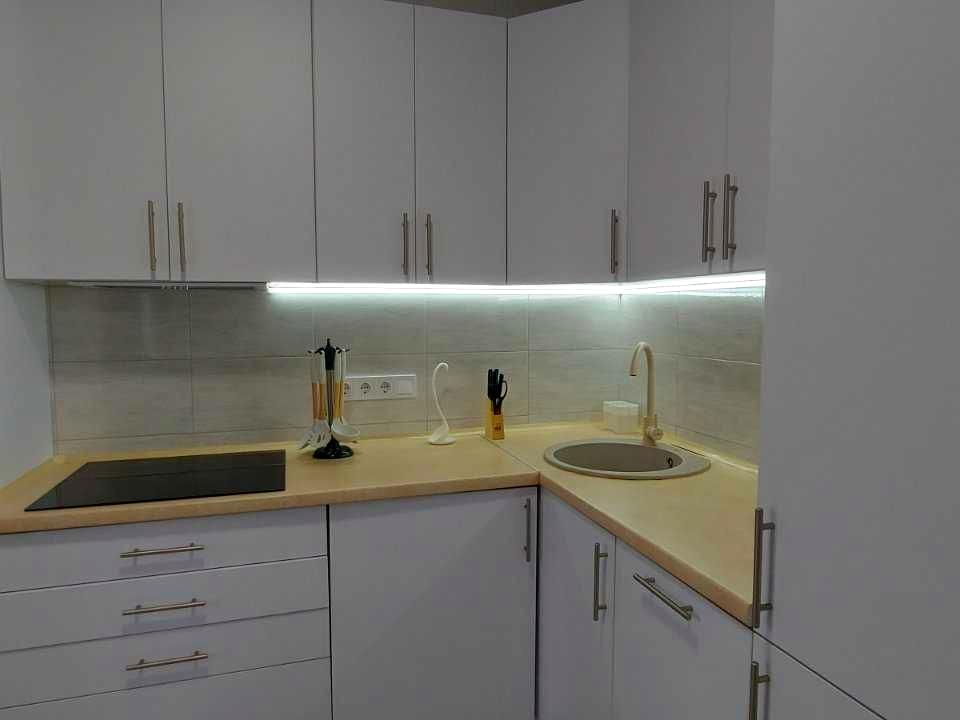 Кухня зі всією побутовою технікою: варильна поверхня, духовка шафа, велика пралка, посудомийка, холодильник, бойлер - все вмонтоване по дизайнерському проєкту.