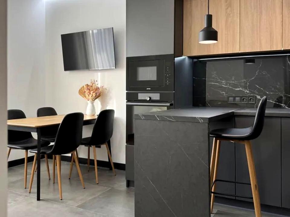 **Є: телевізор, , шафа кухонна, духова піч, витяжка, мікрохвильовка, холодильник, посудомийна машинка.