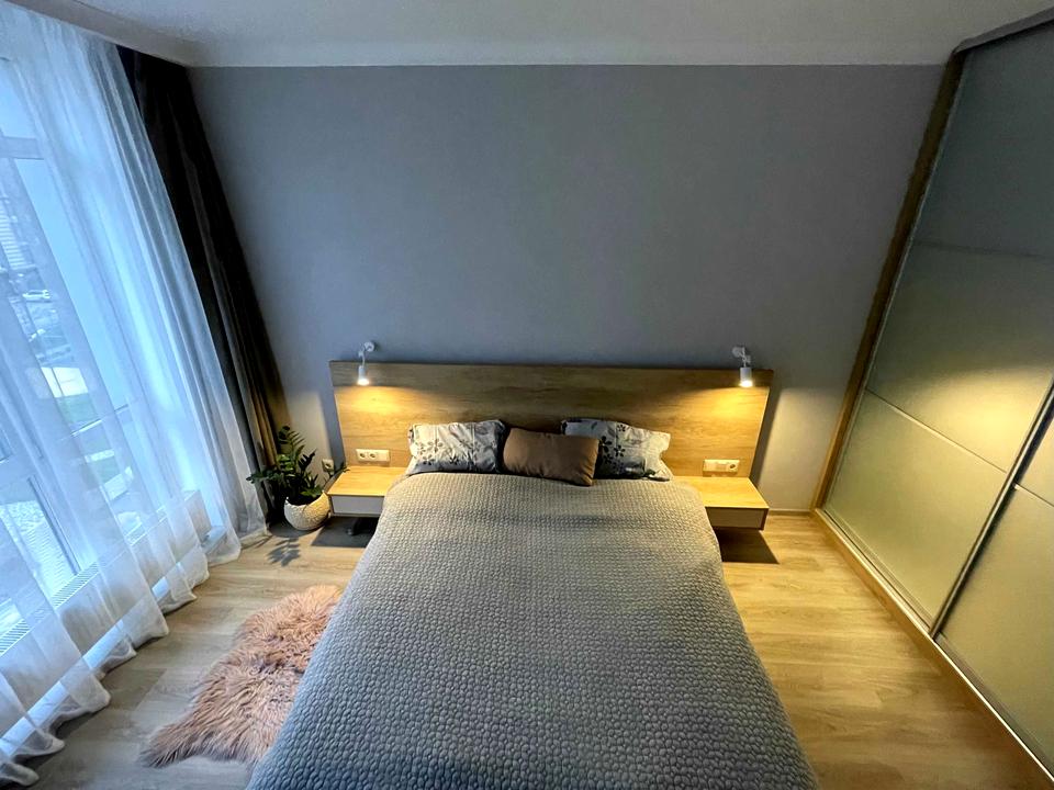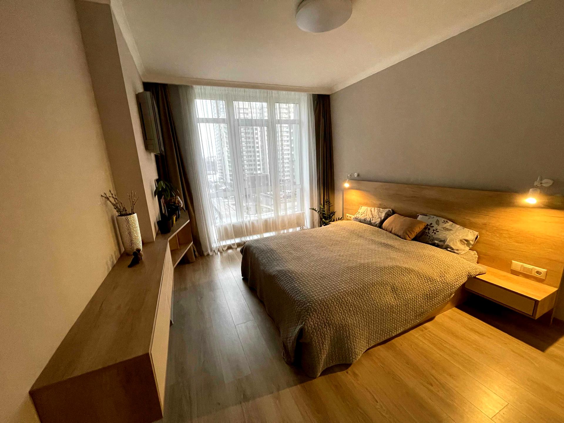 - Окрема простора спальня з великим ліжком та просторою шафою