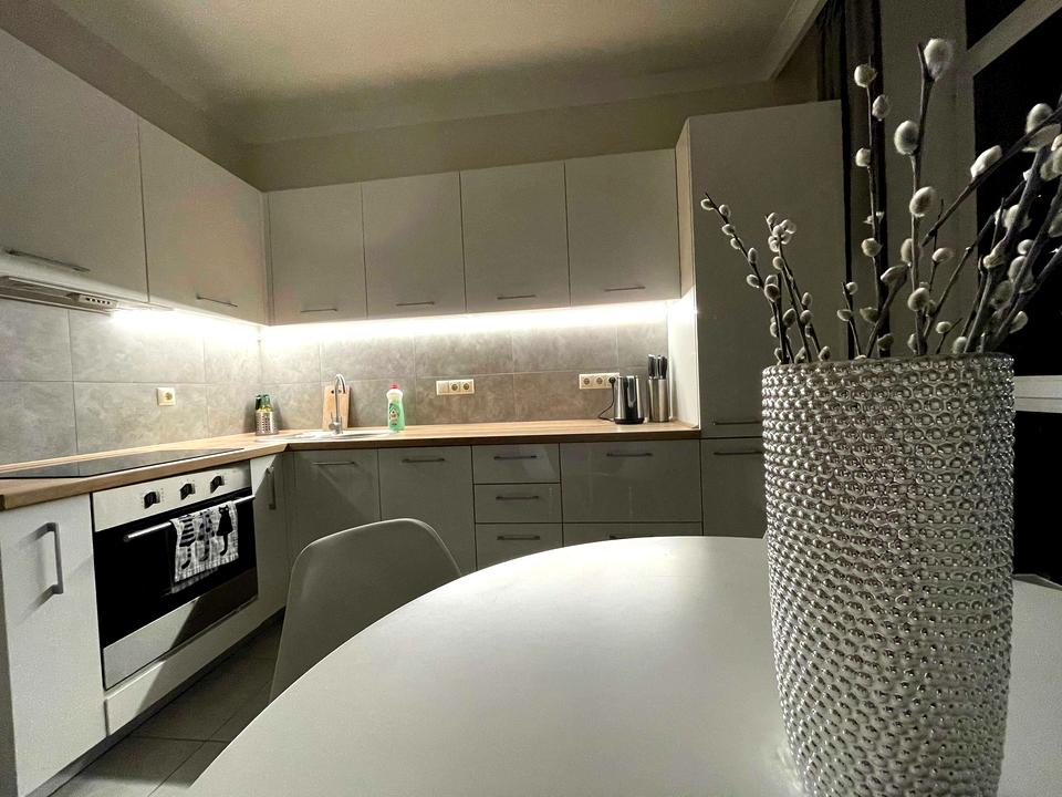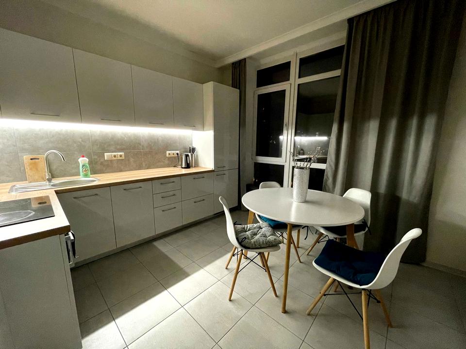 - Сучасна вбудована кухня з усією необхідною побутовою технікою (піч, посудомийна машина, холодильник, мікрохвильовка, тостер, чайник)