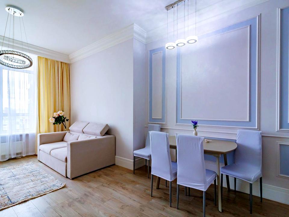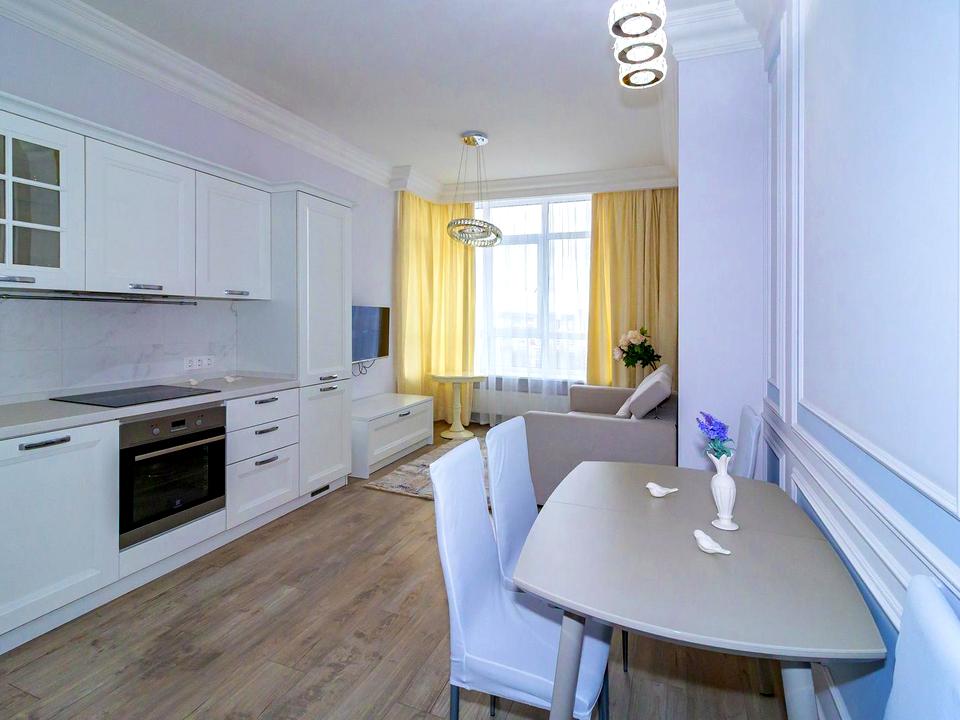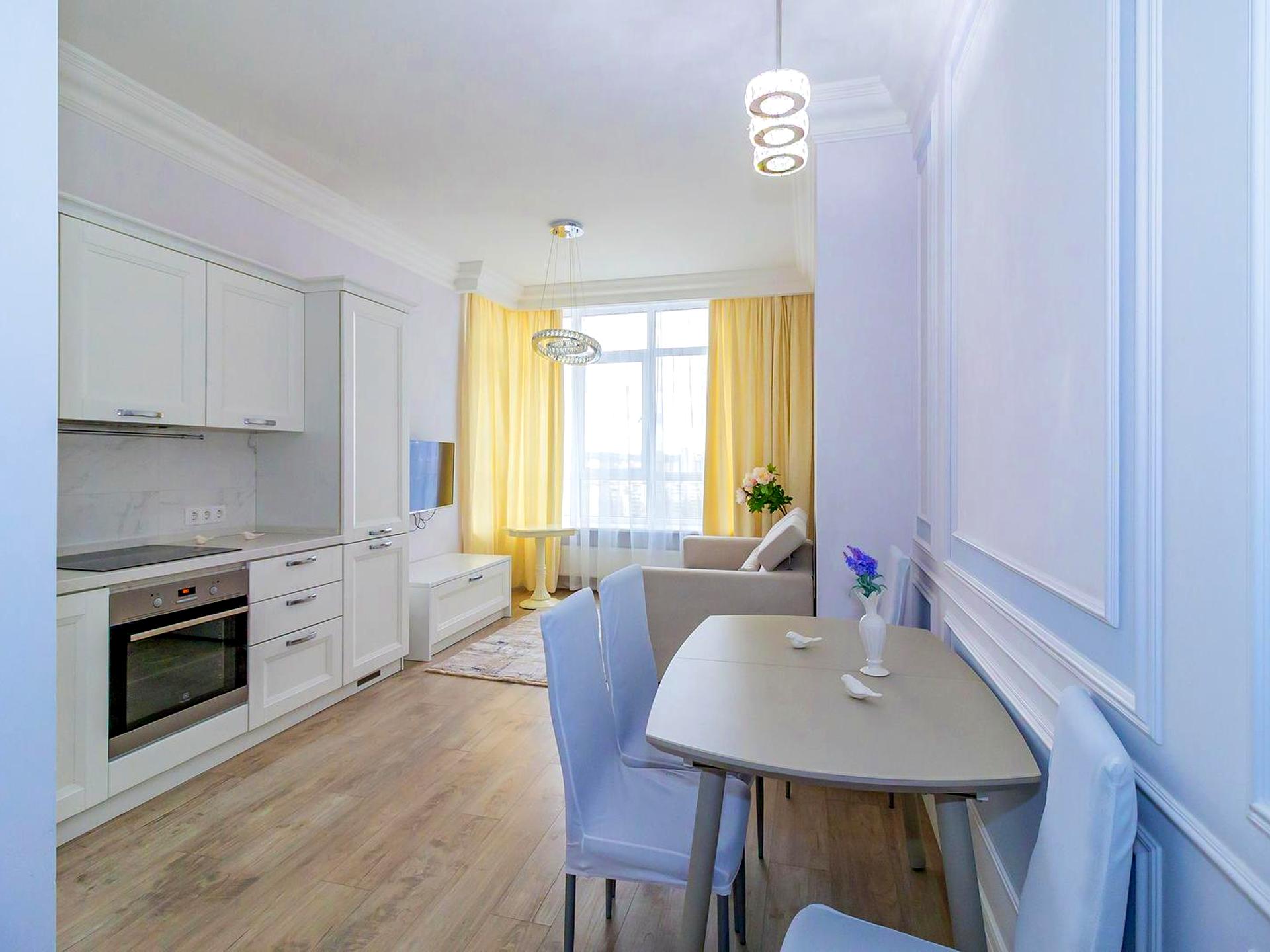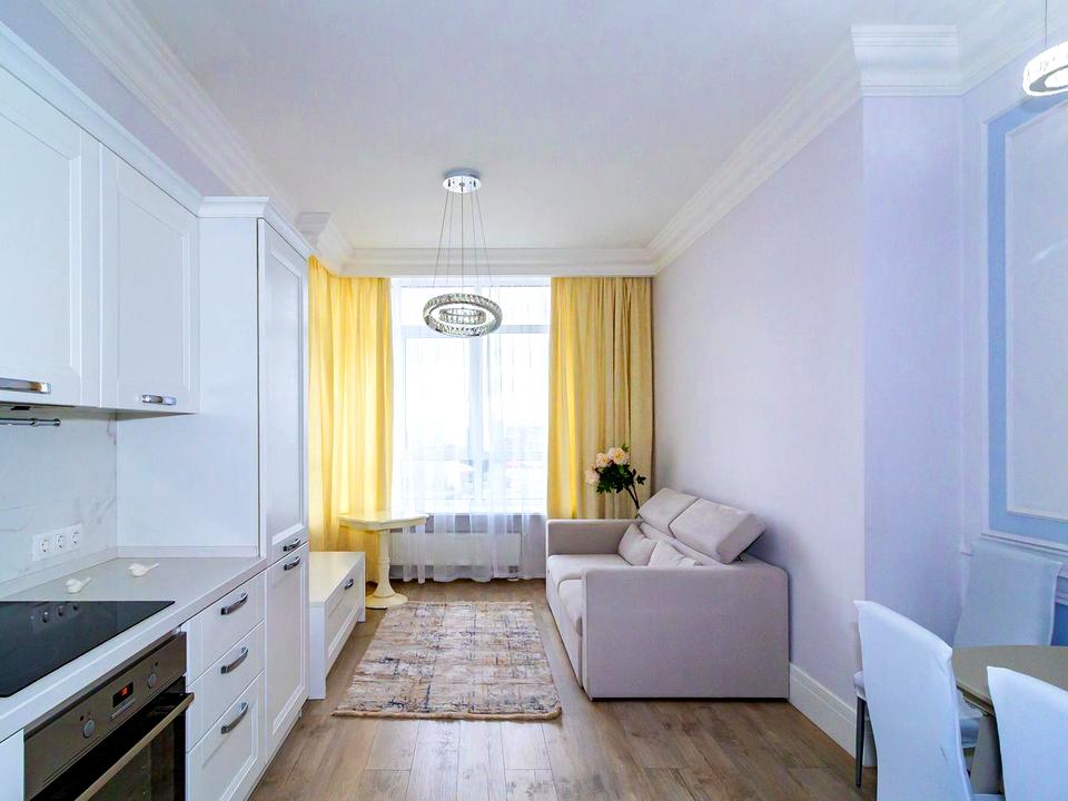 Дизайнерський ремонт в сучасному стилі. Планування: кухня-вітальня, спальня.У ремонті використані якісні матеріали: італійська вбудована кухня Stosa, стіл обідній, дві великі шафи-купе, розкладний диван, ліжко з ортопедичним матрацом.Є абсолютно вся побутова техніка європейських брендів: пральна машина, посудомийка, кондиціонер, плазмові телевізори, холодильник.