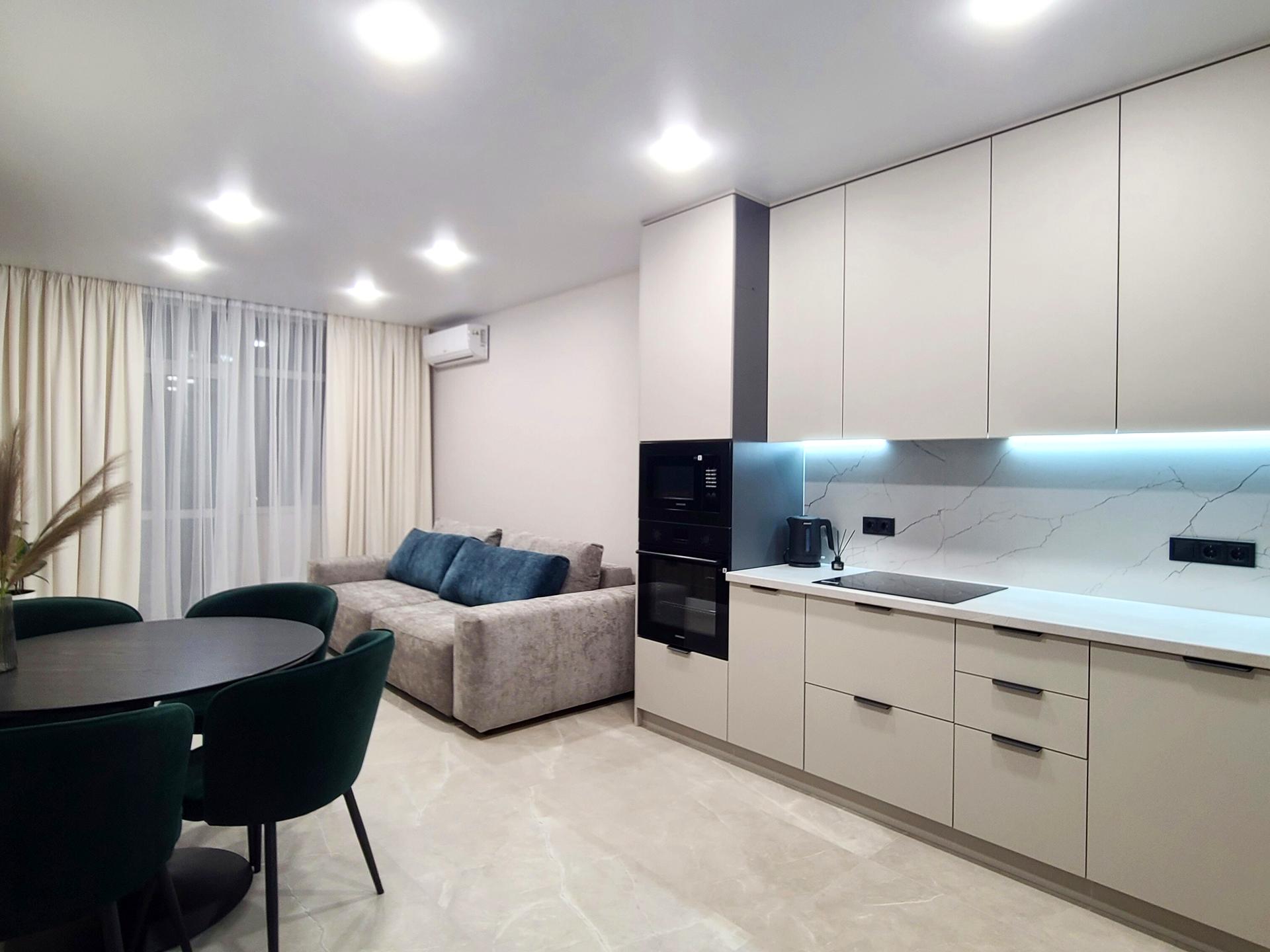 Кухня-вітальня: вся техніка - посудомийна машина, вбудований холодильник, мікрохвильова піч, варильна поверхня, духова шафа - все виробництва Samsung. Та електрочайник Philips.