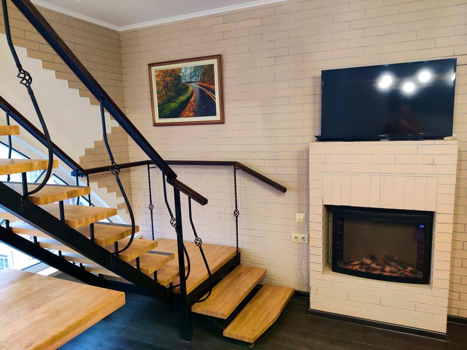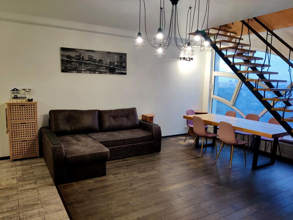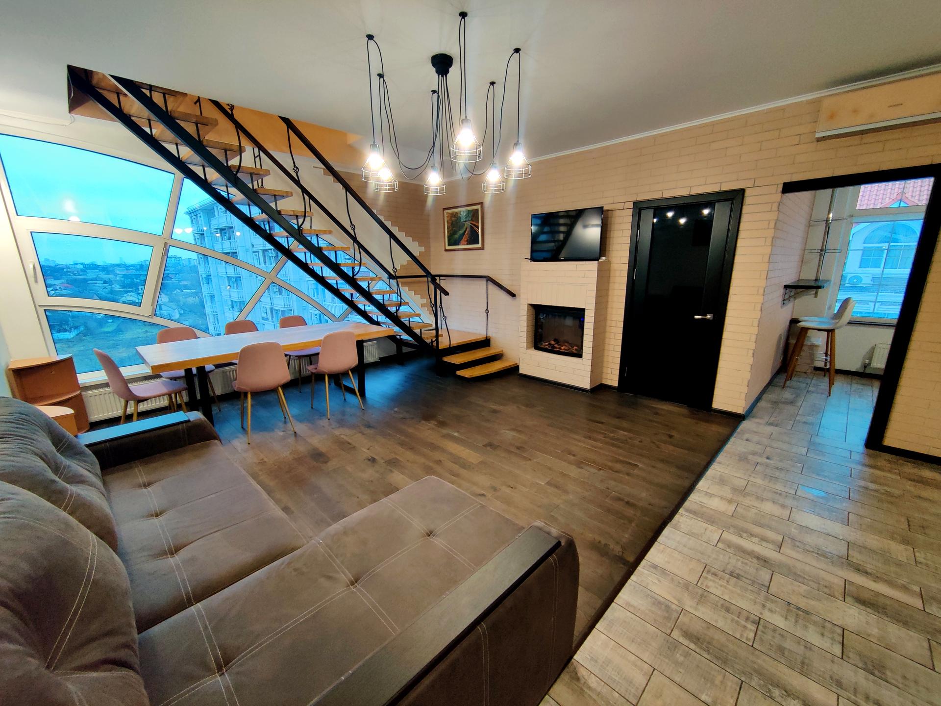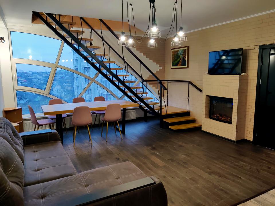 Квартира складається з 2 поверхів. На першому поверсі з коридору Ви потрапляєте у велику гостину кімнату з каміном, де може зібратися за вечерею велика родина або святкувати весела компанія. Також на цьому поверсі окрема кухня, ванна кімната та спальня. Зручні сходи ведуть на другий поверх, де розміщуються дві окремі спальні та власна душова. Вислота стелі 2, 9м, загальна площа квартири майже 100 м.кв. дозволяє відчувати простір та ідеально підійде для родини з дітьми. Кожний матиме персональну зону власного простору при цьому гомінливі дитячі розваги не заважатимуть батькам, а дорослі вечірки не турбуватимуть спокій дітей.