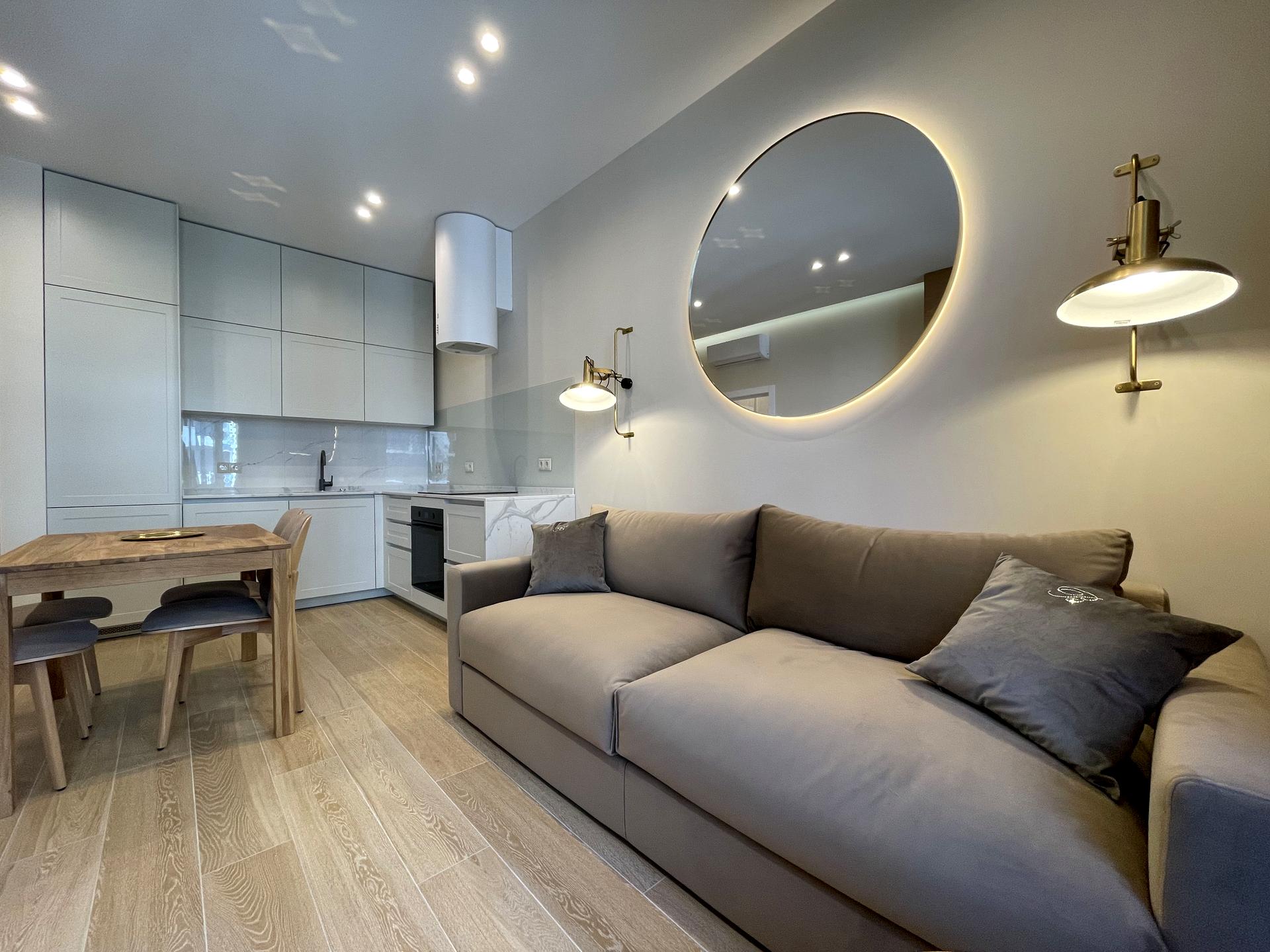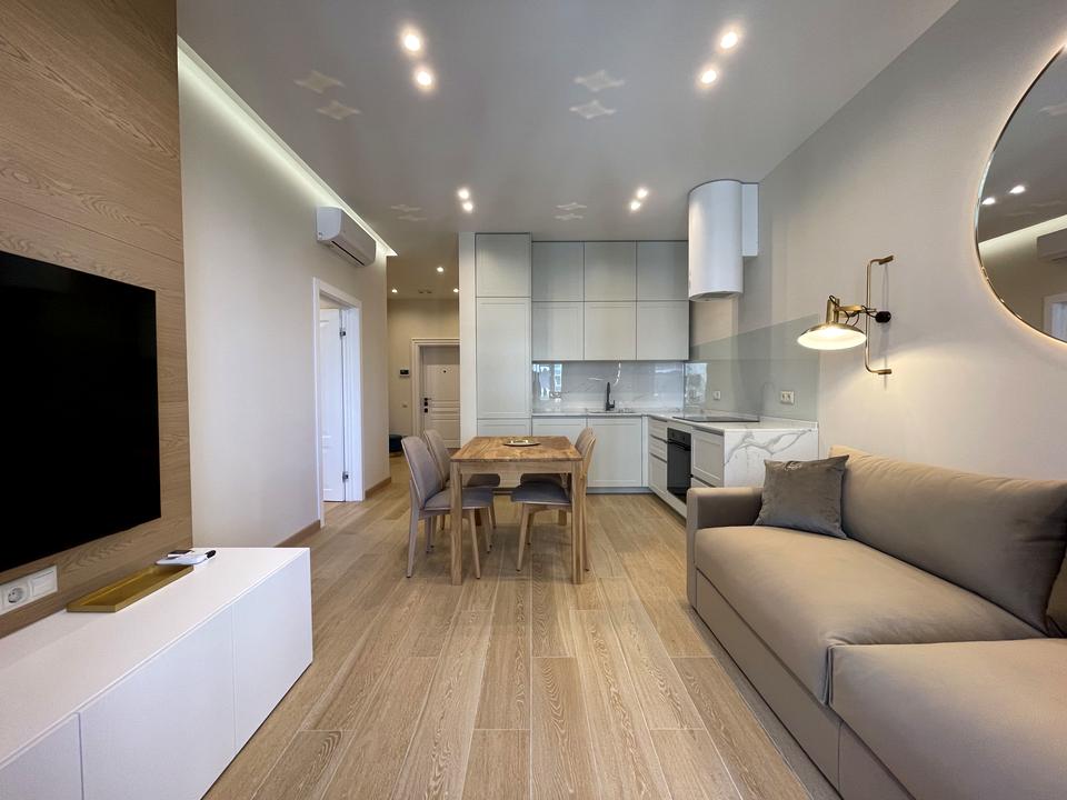 В квартире 2 комнаты, высота потолков 3 метра, Технологія будівництва - Цегляна, Тип будинку - Спец. проект. Газа нет, кухонная плита электрическая. Есть балкон. В квартире есть Телевизор, Подогрев полов, Кондиционер, Стиральная машина, Ванна, Холодильник, Микроволновка, Посудомойная машина, Сигнализация. Дом построен в 2020 году. Общее состояние квартиры - С ремонтом. Безбарьерность: вход в дом на уровне земли. Горячая вода - электрический бойлер. Количество санузлов: 1. Интернет оптоволоконный. Работает без света - вода, отопление, интернет, лифт. Тип кухни - кухня-студия. Количество спален: 1. Есть подземный паркинг, доступный как укрытие. Инфраструктура территории: детская площадка, спортивная площадка, отделенная зона для выгула животных, двор без авто. Комиссия за услуги 25 %