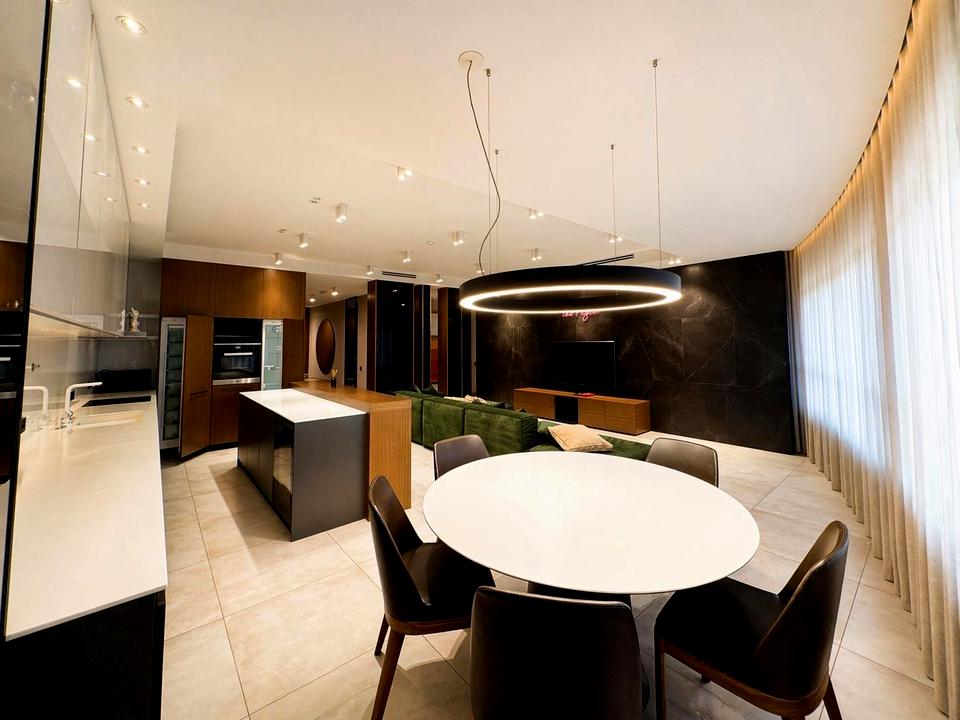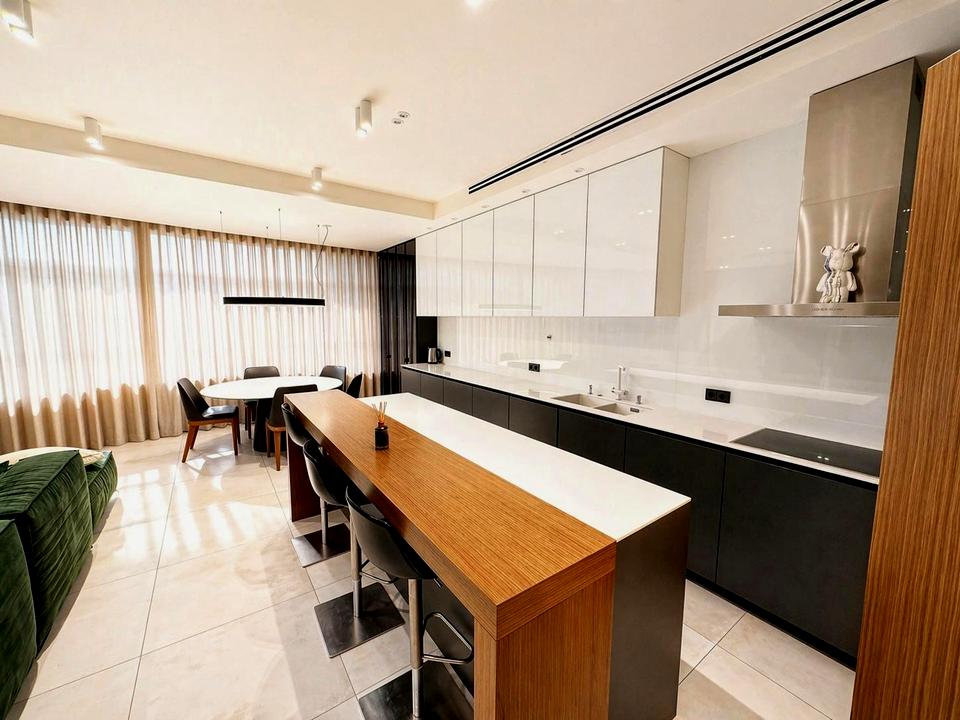 - простора кухня-вітальня з островом, обідньою зоною та зоною відпочинку;