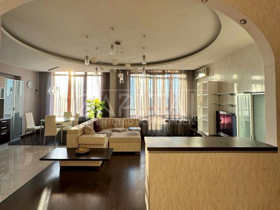 Квартира нещодавно пройшла косметичний ремонт. Вона включає простору кухню, поєднану з їдальнею, велику вітальню, дві окремі спальні, гардеробну кімнату, кладовку, два санвузли та дві лоджії.