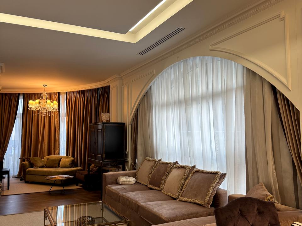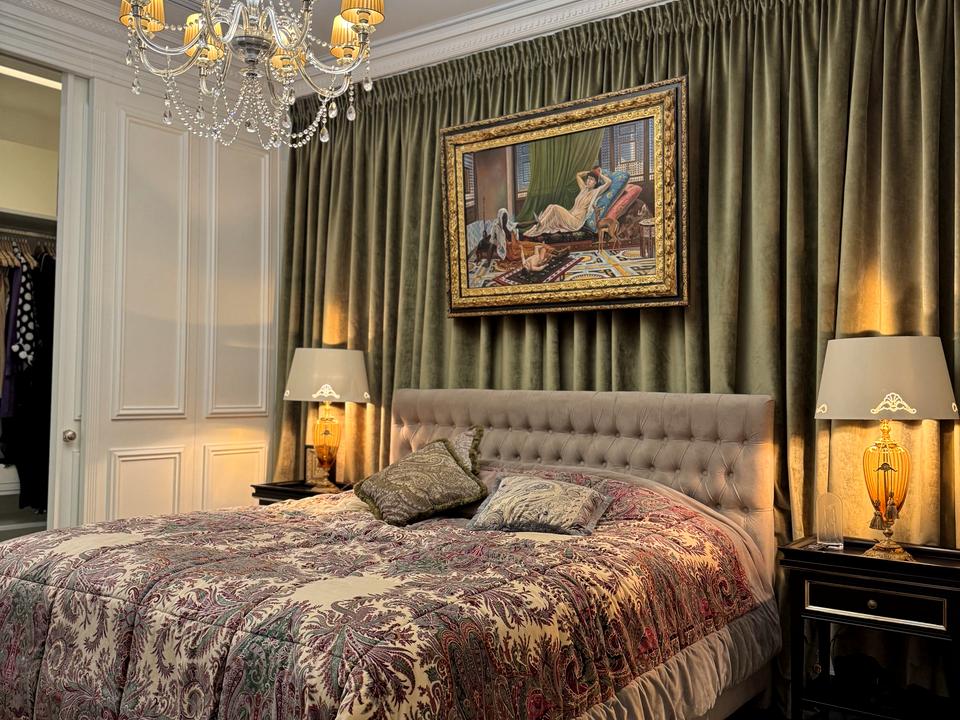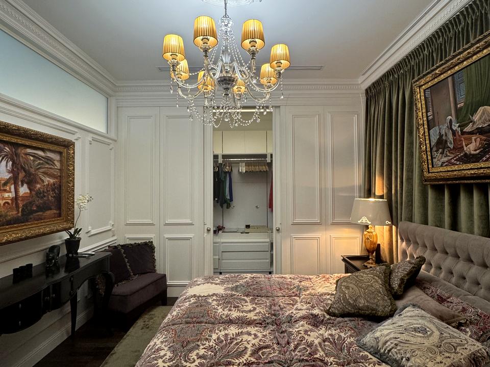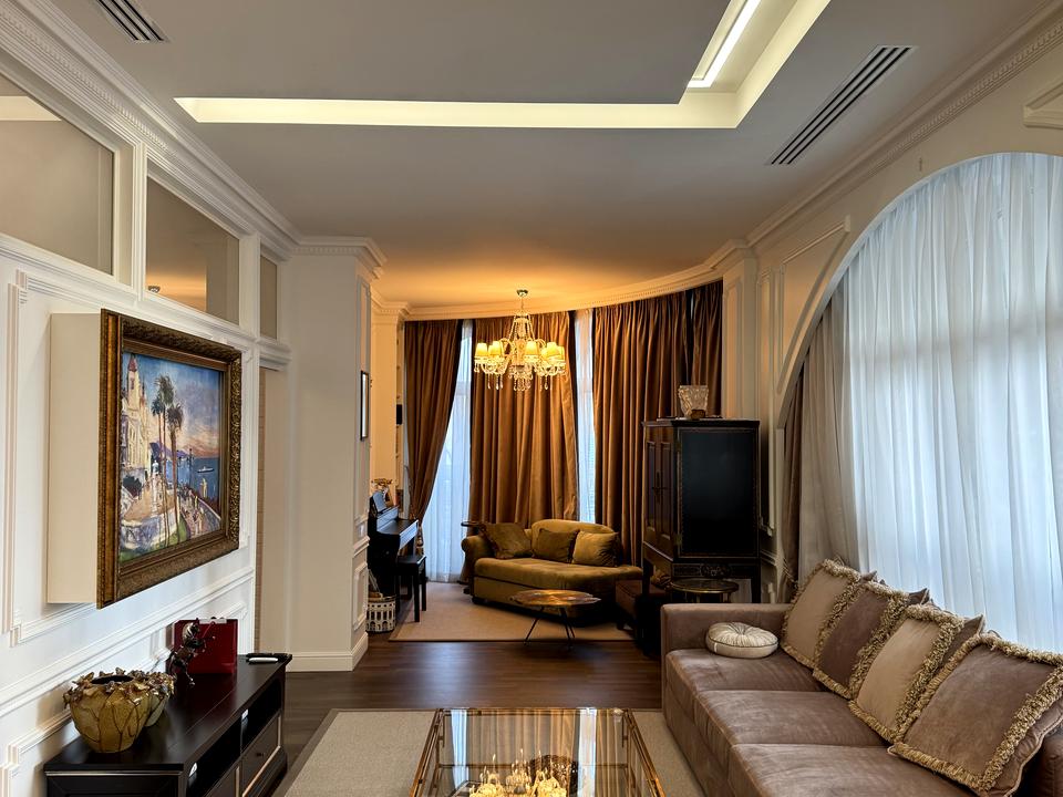 2-х кімнатна Квартира 105 кв. м з дизайнерським ремонтом у стилі французької класики. Арочні вікна вздовж усієї вітальні, поєднаної зі столовою зоною. У спальні є прихована вбиральня . Система сигналізації. Укомплектовані Меблями та текстилем.