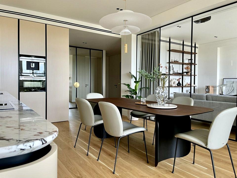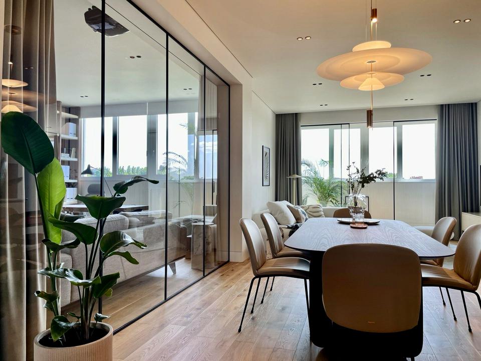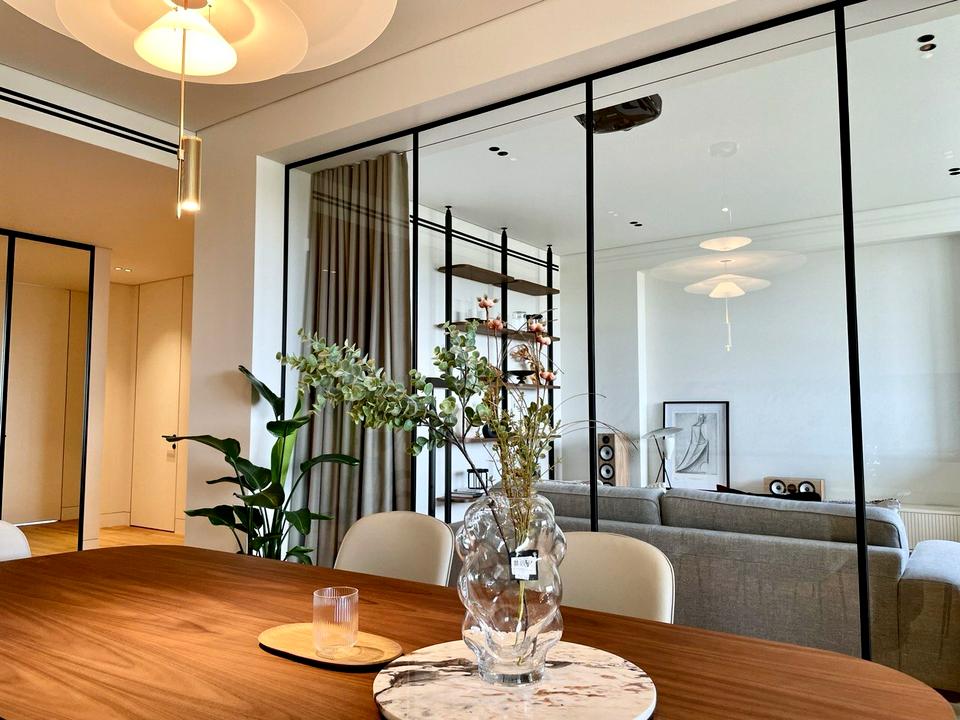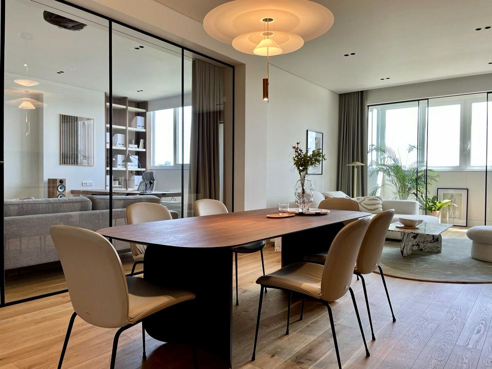 Вся квартира виконана дизайнерами з використанням натуральних та високоякісних матеріалів, є вся необхідна техніка, по ксій квартирі встановленно центральне кондиціування та вентиляція з очищенням повітря схованого монтажу, підігрів підлоги та дзеркал, вся техгіка передових німецьких та італійських виробників, сховані підсвітки та фурнітурні єлементи, все на голосовому управлінні, домашній кінотеатр, Hi-Fi акустика.