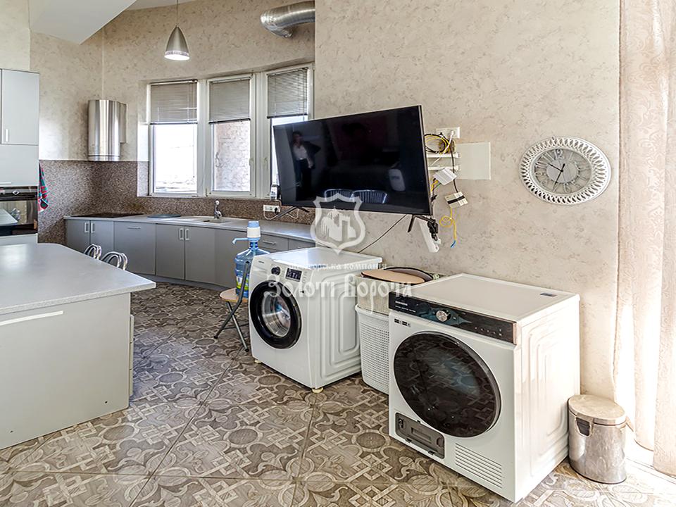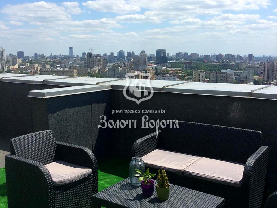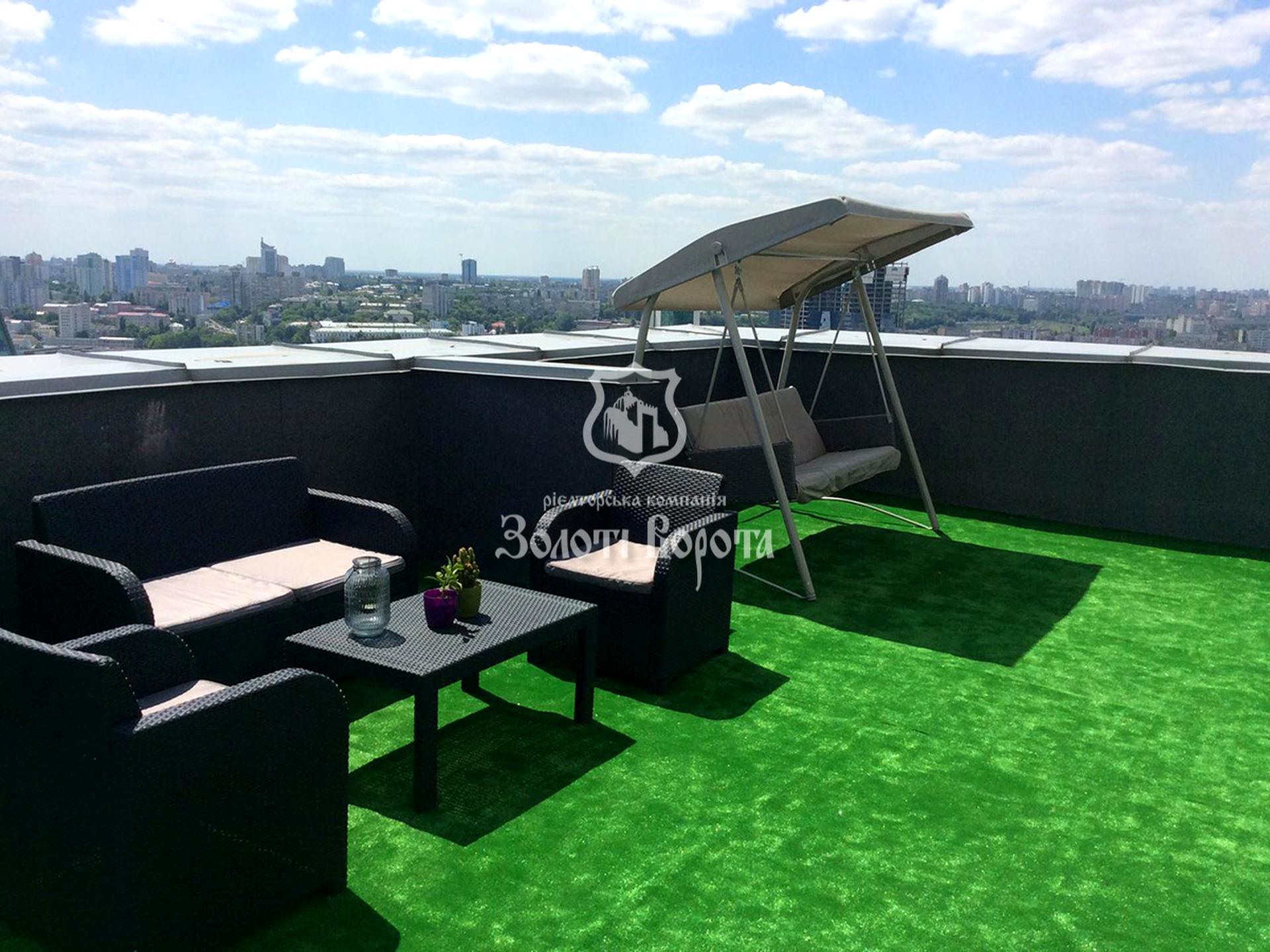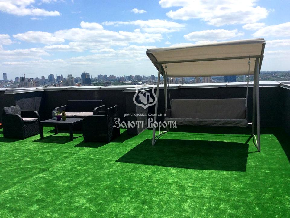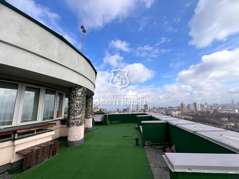 Квартира розташована на 25-му поверсі 25-поверхового будинку бізнес-класу. Загальна площа становить 500 м2, але головна перевага — приватизований дах площею 350 м2, який можна перетворити на повноцінний другий поверх. Площа першого поверху — 98 м2, другого — 52 м2. Оселя має сучасну облаштовану кухню з притягувачами та технікою (бойлер, духова шафа, плита, витяжка).