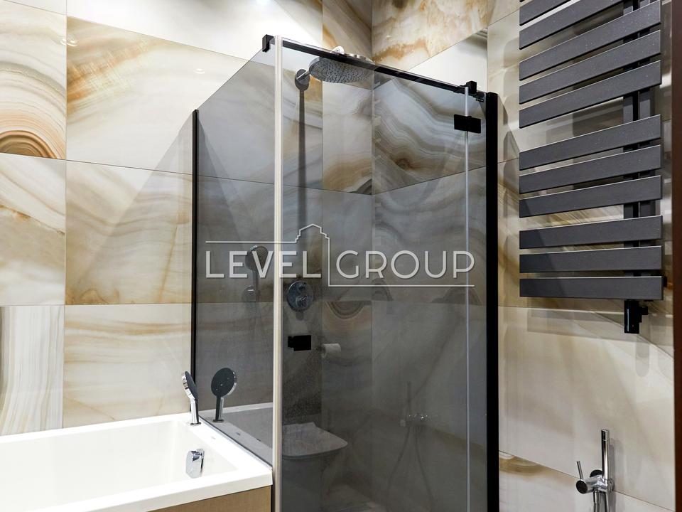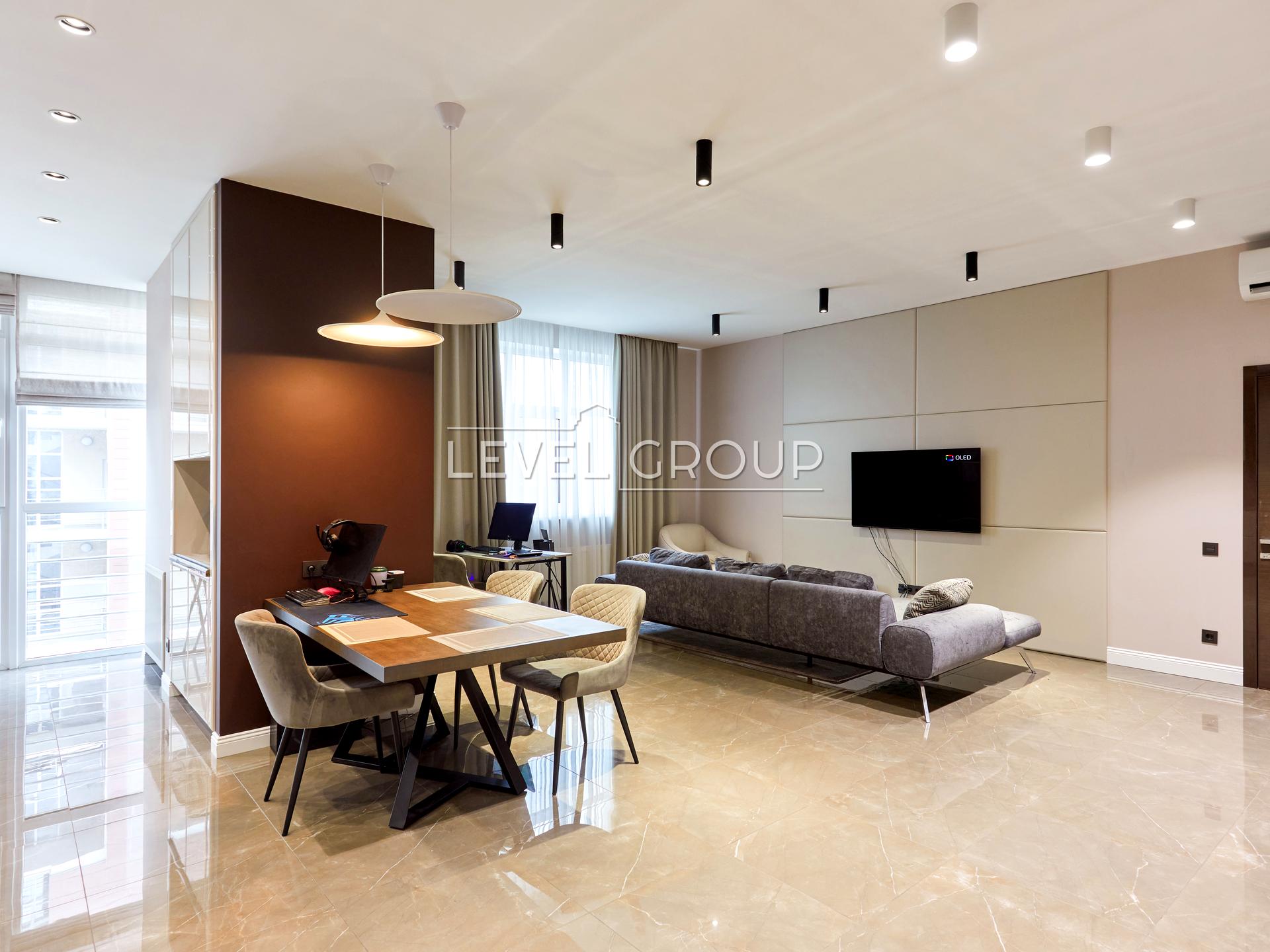 Ремонт выполнен из высококачественных материалов: мрамор Emperador Dark (Испания), керамогранит Graniti fiandre (Италия), полы: масив ореха.