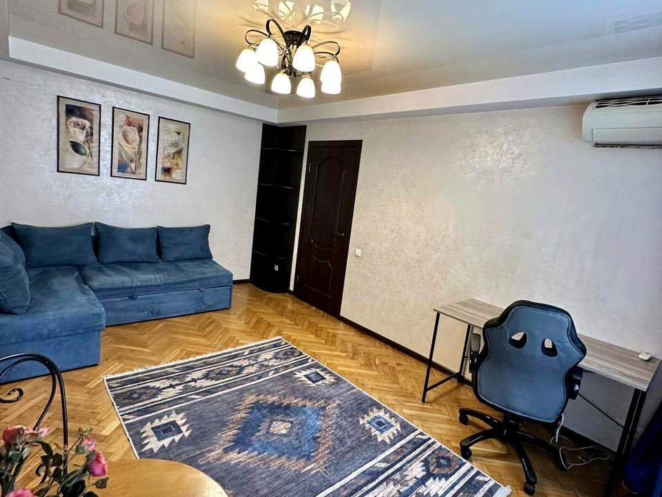 Меблі: розкладний диван, компʼютерний стіл, двоспальне ліжко, містка шафа-купе, кухонний гарнітур, обідній стіл, стільці.