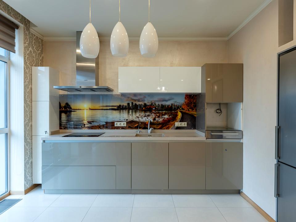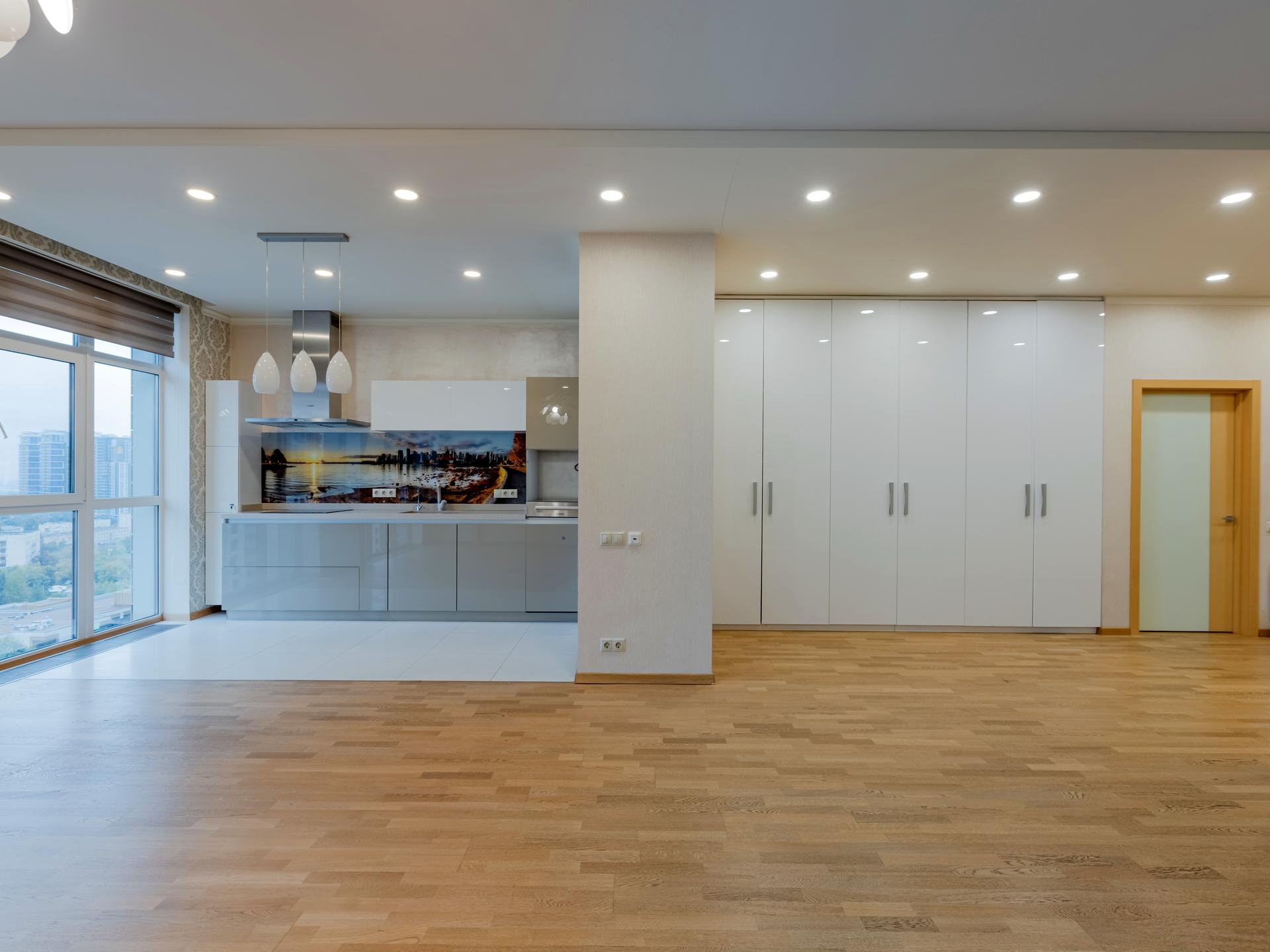 - Кухня-вітальня з панорамними вікнами й виходом на балкон