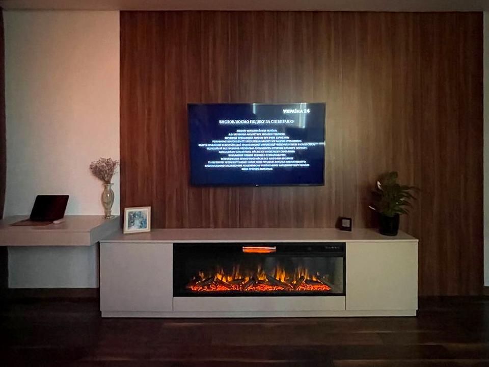 Кухня-вітальня: вбудований електричний камін, великий кутовий диван, вбудована кухня з посудомийною машиною.