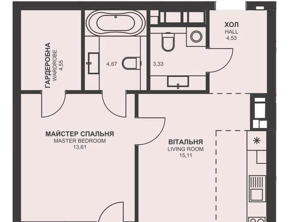 Площа 58 м² дозволяє реалізувати повноцінну спальню з власним санвузлом і окремою гардеробною, простору кухню-вітальню та гостьовий санвузол. За рахунок лоджії є можливість збільшити житлову кімнату, створивши ще більш функціональний та світлий простір.