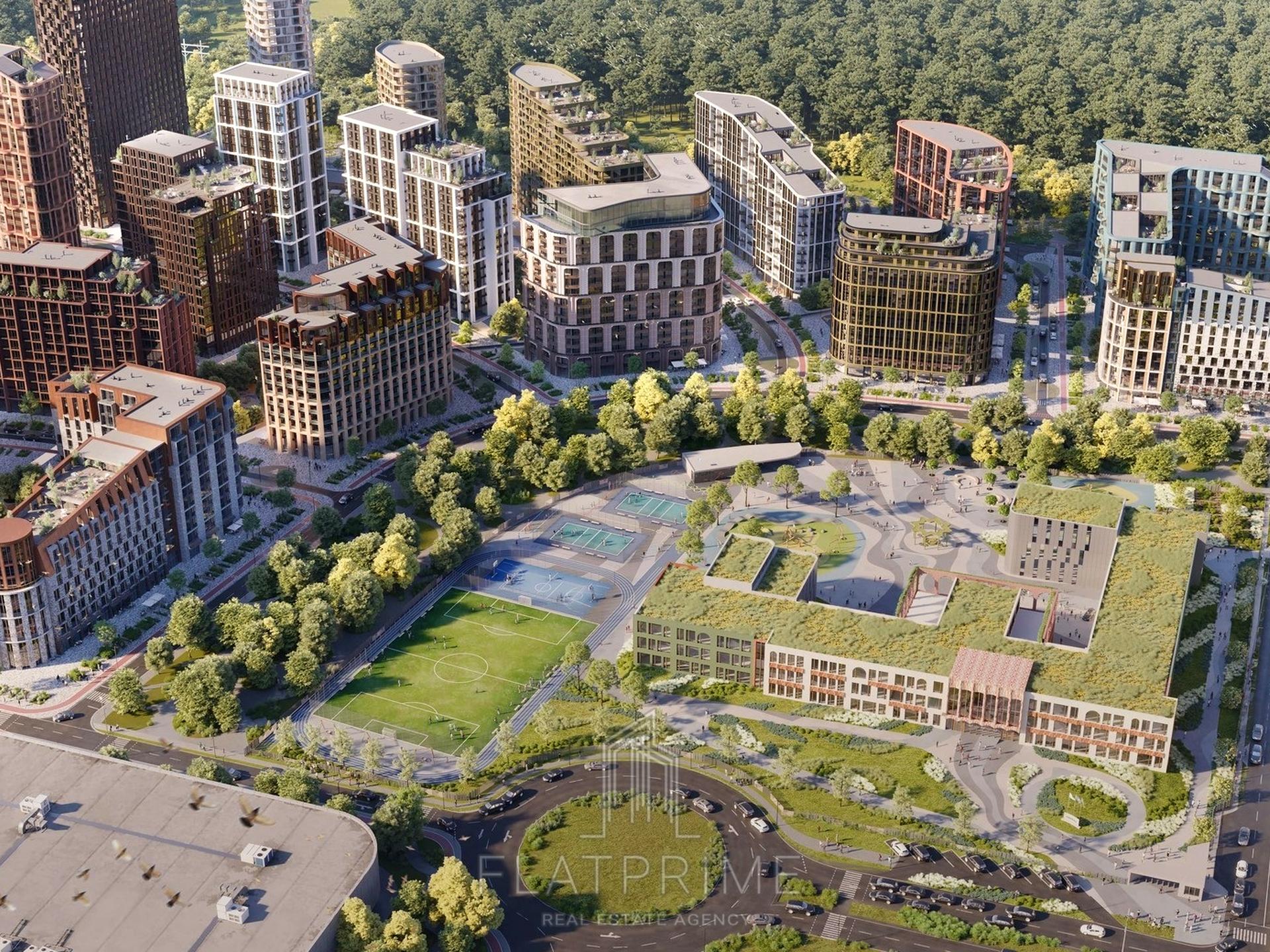 Школа, дитсадок, власний парк, спорт- і дитячі майданчики, кав’ярні, магазини, сервіси.